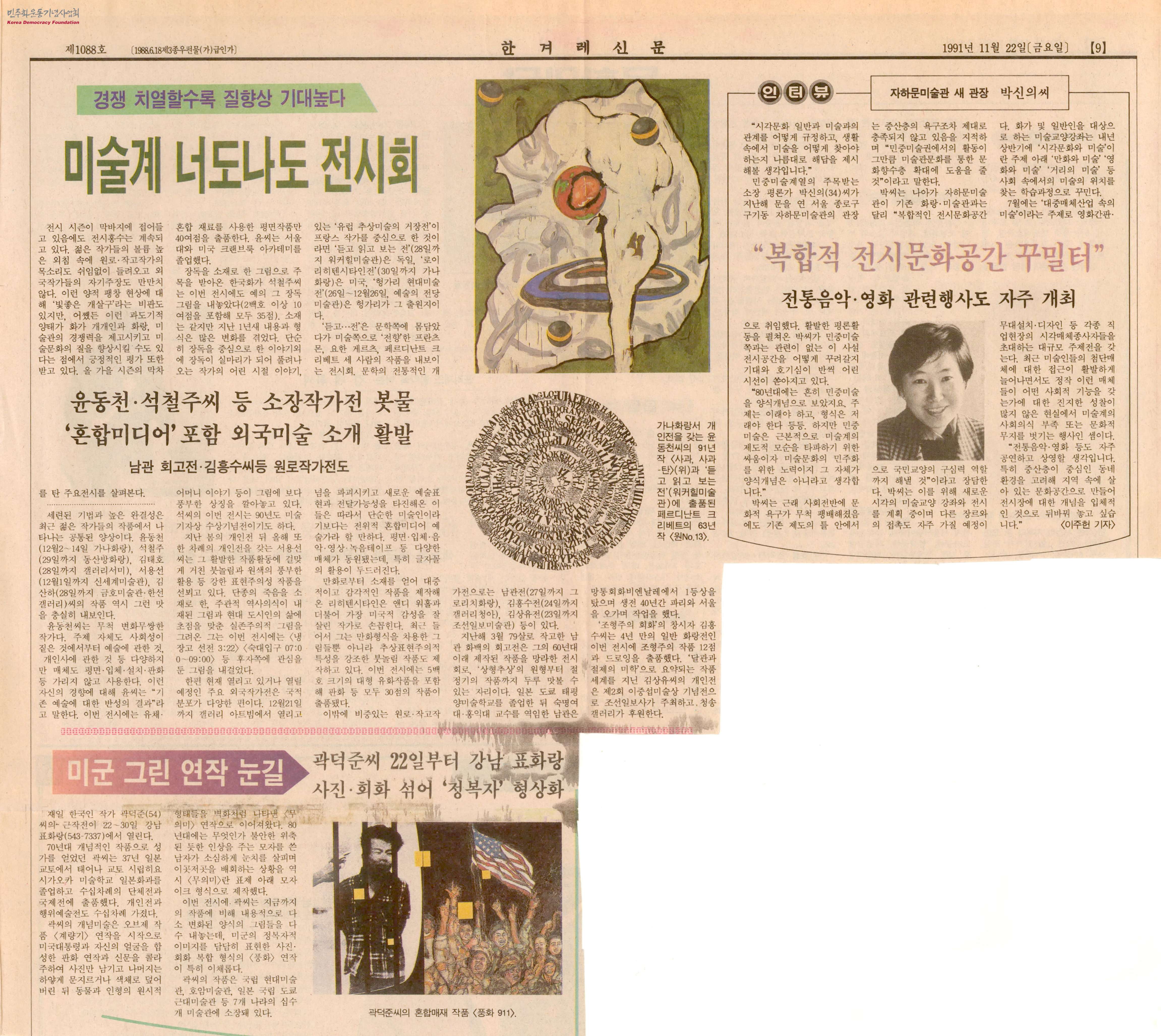 - 윤동천, 석철주, 김태호, 서용선, 김산하 등의 작품전 일정과 개최 장소, 전시 내용, 전시 작품 등의 내용이 담겨 있는 신문스크랩