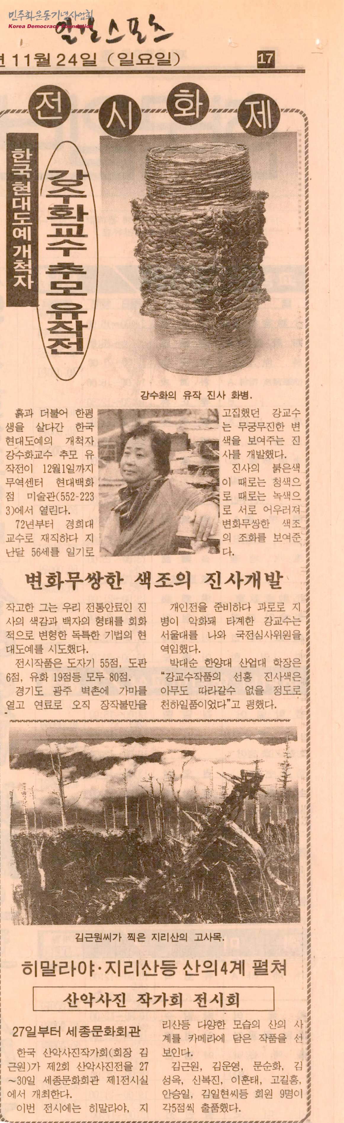 - 한국 현대도예의 개척자 강수화 교수 추모 유작전이 1991년 12월 1일까지 무역센터 현대백화점 미술관에서 진행되며, 전시작품은 도자기 55점, 도판 6점, 유화 19점 등 모두 80점이라는 내용의 신문스크랩