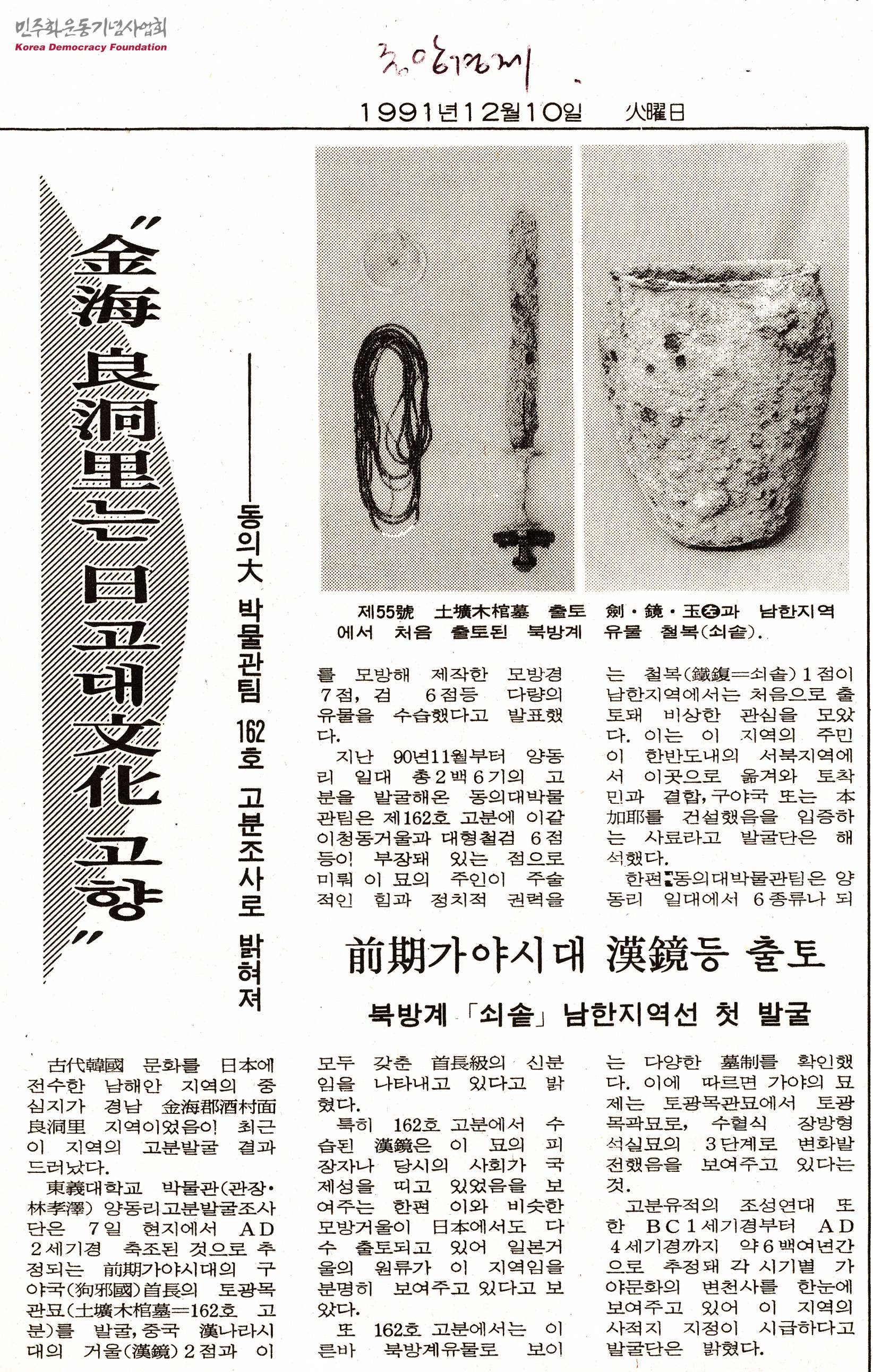 - 동의대 박물관 팀의 양동리 162호 고분 발굴에 대한 내용을 담은 신문스크랩으로, 해당 고분에는 모방거울을 비롯한 전기가야시대 유물들이 다량 출토되었는데 이를 통해 고대한국 문화를 일본에 전수한 남해안 지역의 중심지가 김해 양동리라는 것을 알 수 있음