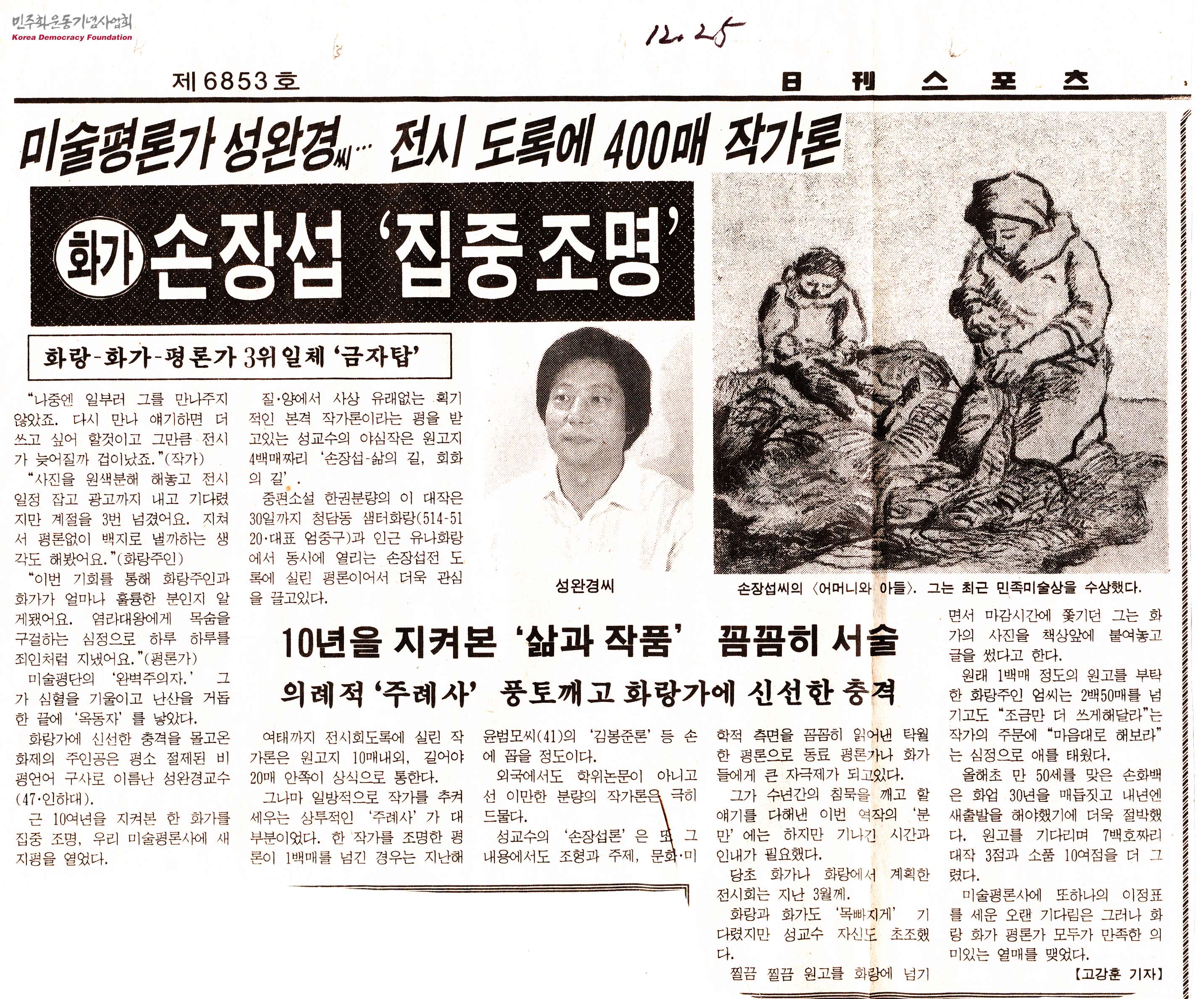 - 성완경이 근 10여 년을 지켜본 손장섭에 대한 평론 '손장섭-삶의 길, 회화의 길'에 대한 기사로 손장섭은 12월 30일까지 청담동 샘터화랑과 유나화랑에서 진행하였으며 손장섭 전의 도록에 평론이 실렸고 평론을 작성하던 경험을 담고 있는 신문스크랩