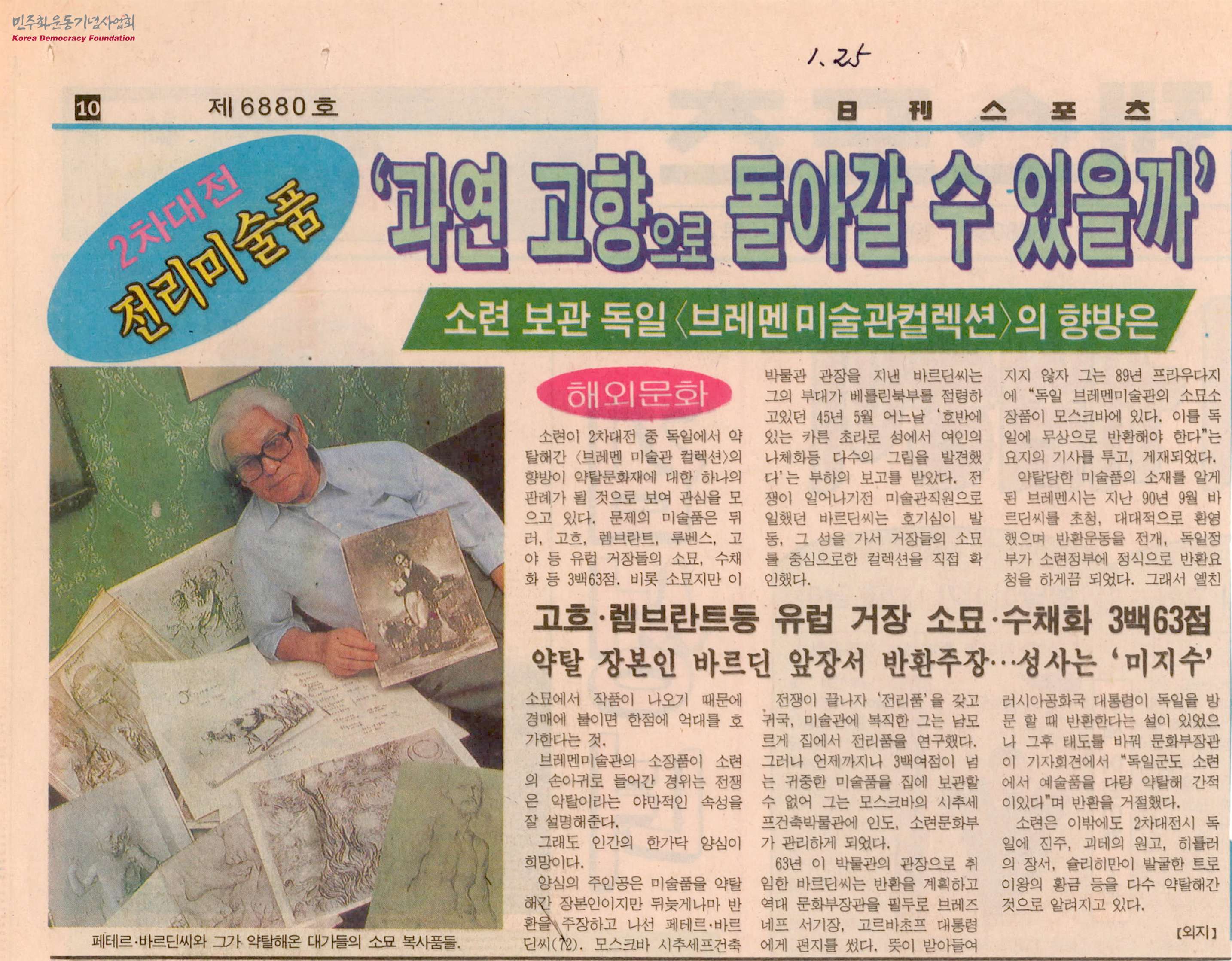 - 소련이 2차대전 중 독일에서 약탈해간 <브레메 미술관 컬렉션> 내용을 다룬 신문스크랩으로, 뒤러·고스·렘브란트 등 유럽 거장들의 소묘, 수채화 등 363점이 있으며 약탈 장본인인 바르딘이 앞장서 반환을 주장하고 있지만 성사는 아직 '미지수' 라고 함