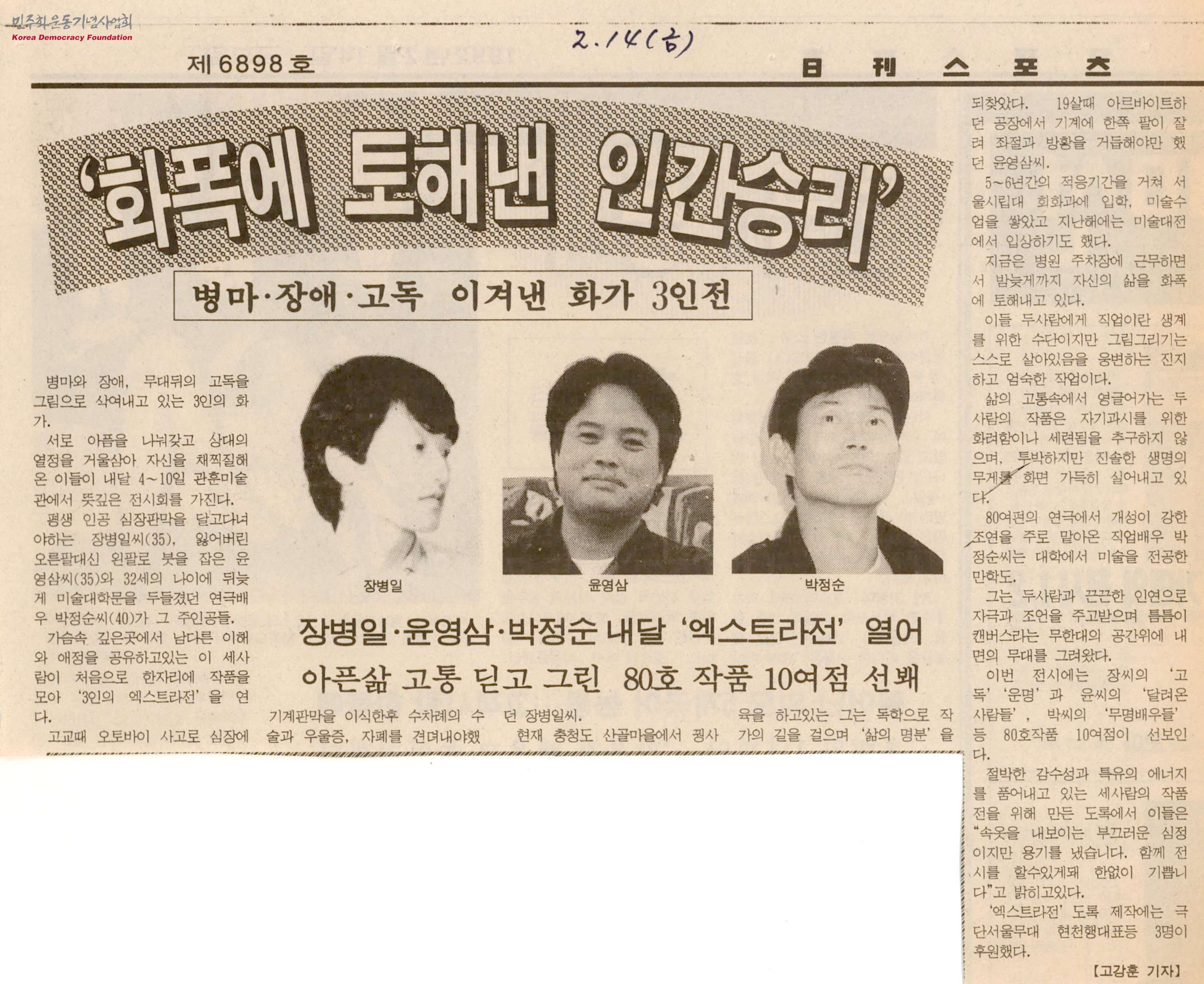 - 병마와 장애, 무대뒤의 고독을 그림으로 삭여내고 있는 3인의 화가전인 「3인의 엑스트라전」이 3월 4일부터 10일까지 관훈미술관에서 열린다는 내용의 신문스크랩으로, 아픈 삶을 딛고 그린 80호 작품 10여점을 선보일 예정임
