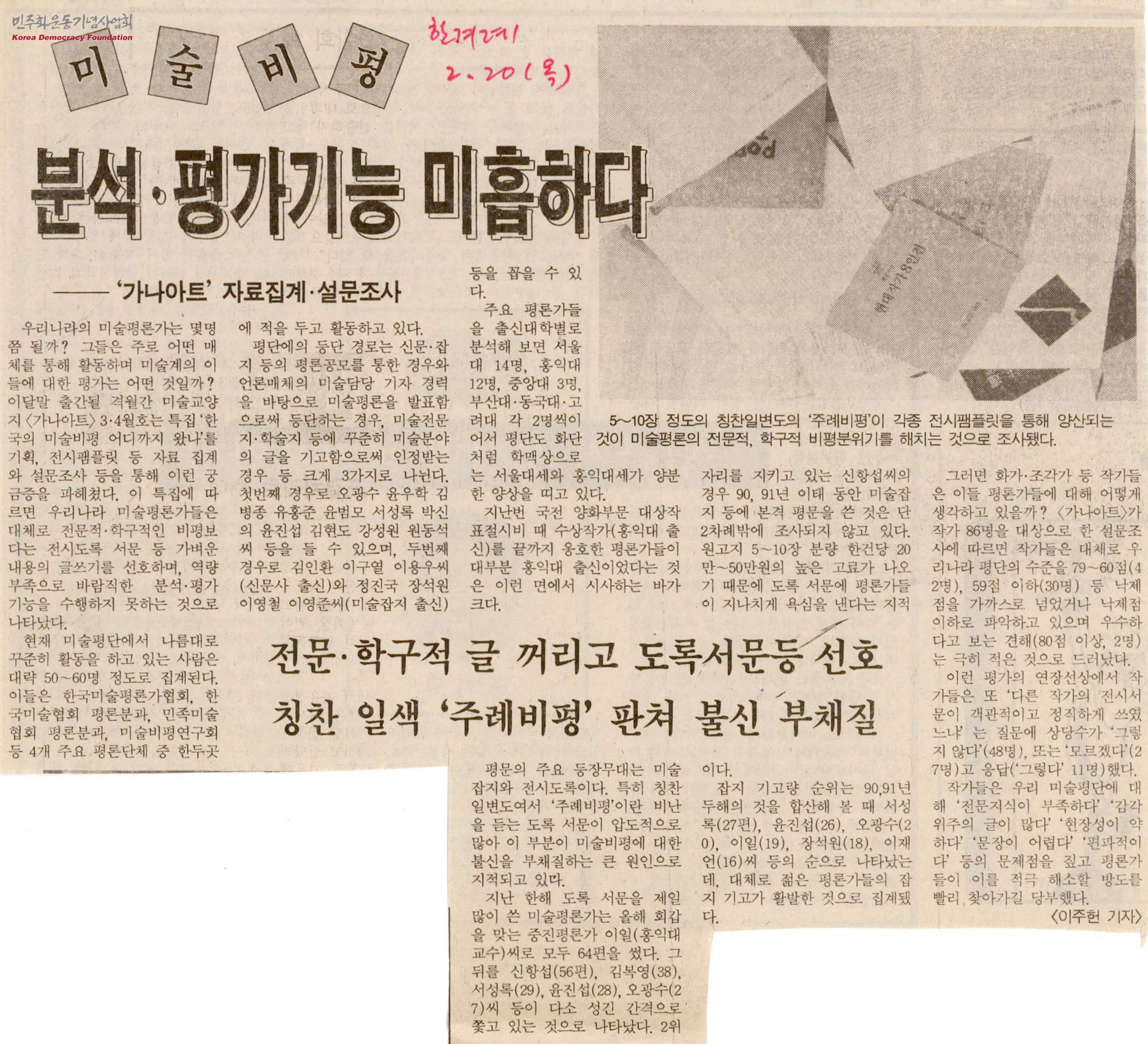 [신문스크랩]미술비평-분석·평가기능 미흡하다-'가나아트' 자료집계·설문조사