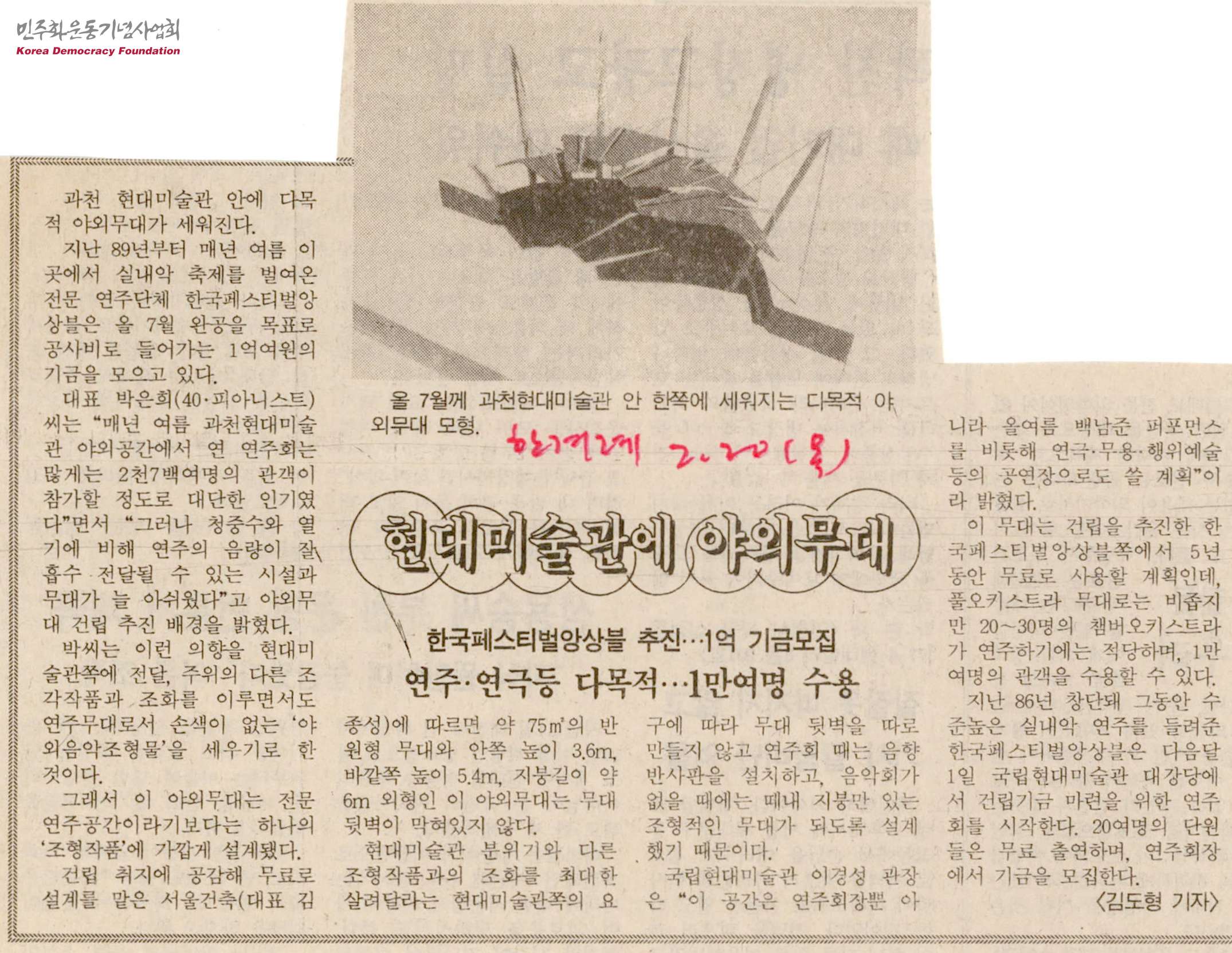 - 지난 89년부터 매년 여름 과천 현대미술관에서 실내악 축제를 벌여온 전문 연주단체 한국 페스티벌앙상블에서 올 7월 완공을 목표로 하는 '다목적 야외무대'를 설치한다는 내용을 담은 신문스크랩으로, 이 야외무대는 연주·연극 등 다목적 이용공간으로 계획되었으며 1만여 명이 수용가능함