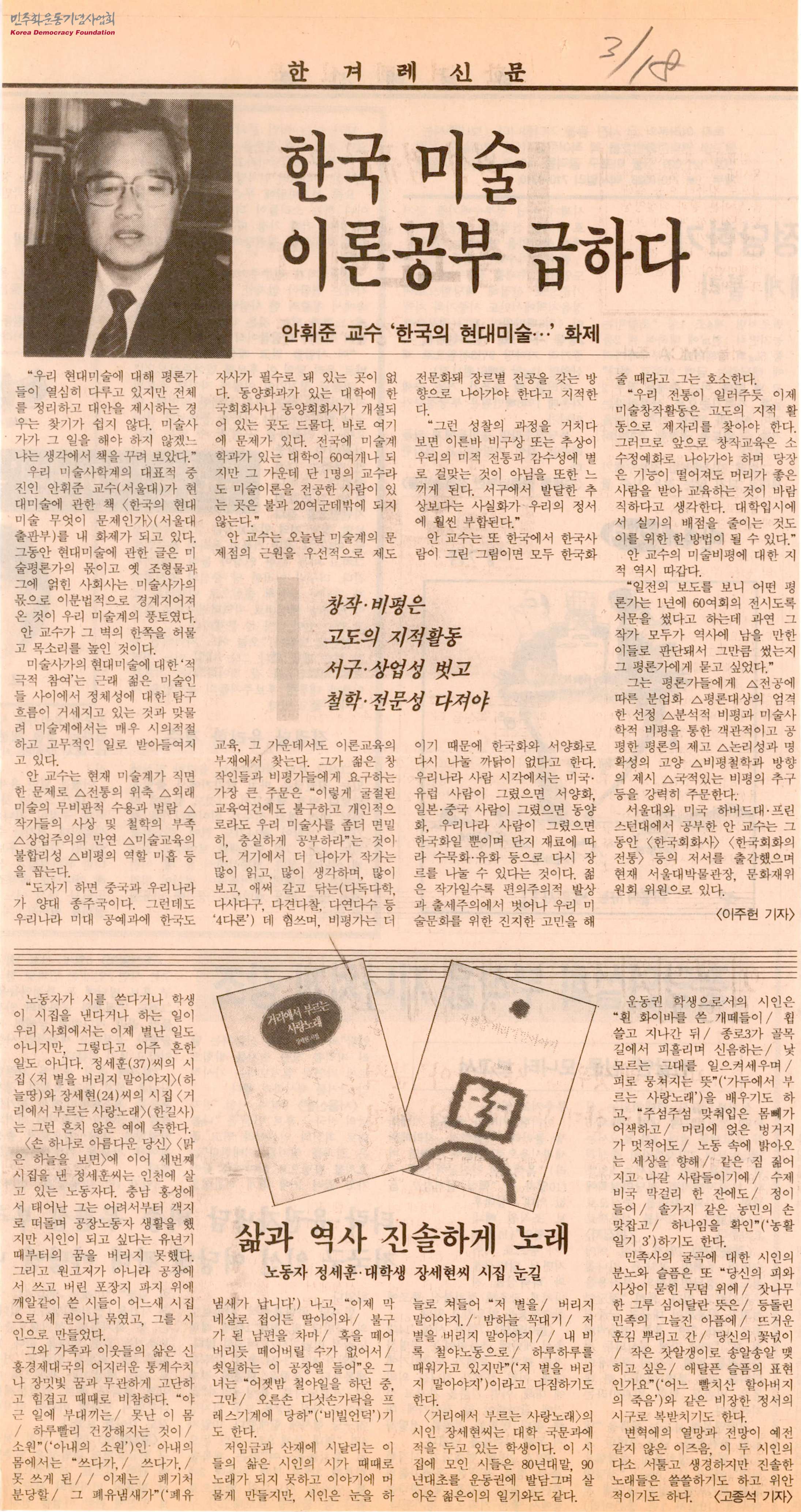 - 한국 미술사학계의 대표적 중진인 안휘준 교수의 현대미술에 관한 책<한국의 현대미술 무엇이 문제인가>를 내 화제를 불러일으키고 있다는 내용을 담은 신문스크랩으로, 그동안 현대미술에 관한 글은 미술평론가의 몫이고 옛 조형물과 그에 얽힌 사회사는 미술사가의 몫으로 이분법적으로 경계 지어져온 미술계의 풍토를 허물어버리고자 책을 쓰게 되었다고 밝힘