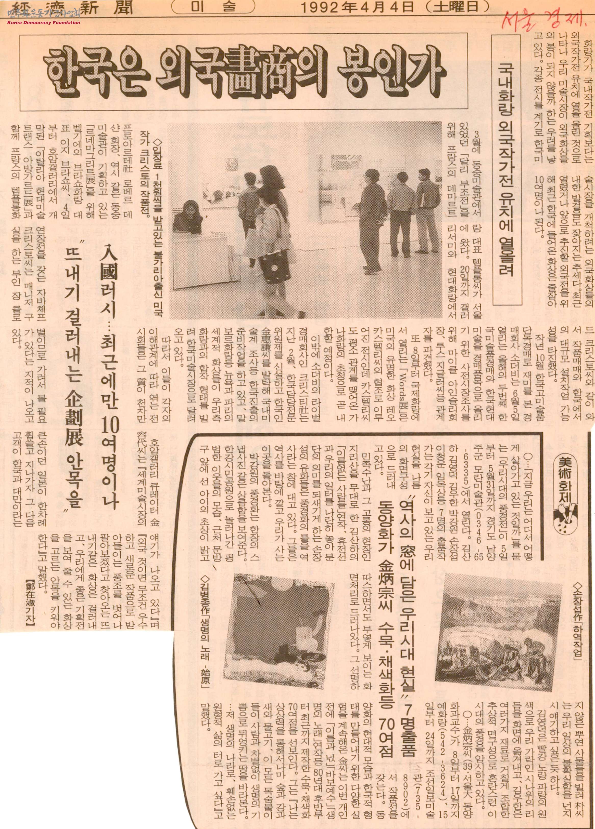 - 화랑가에서 국내작가전 기획보다는 외국작가전 유치에 열을 올린 것으로 나타나 우리 미술시장이 외국화상들의 봉이 되지 않을까 하는 우려를 낳고 있는 내용을 담은 신문스크랩