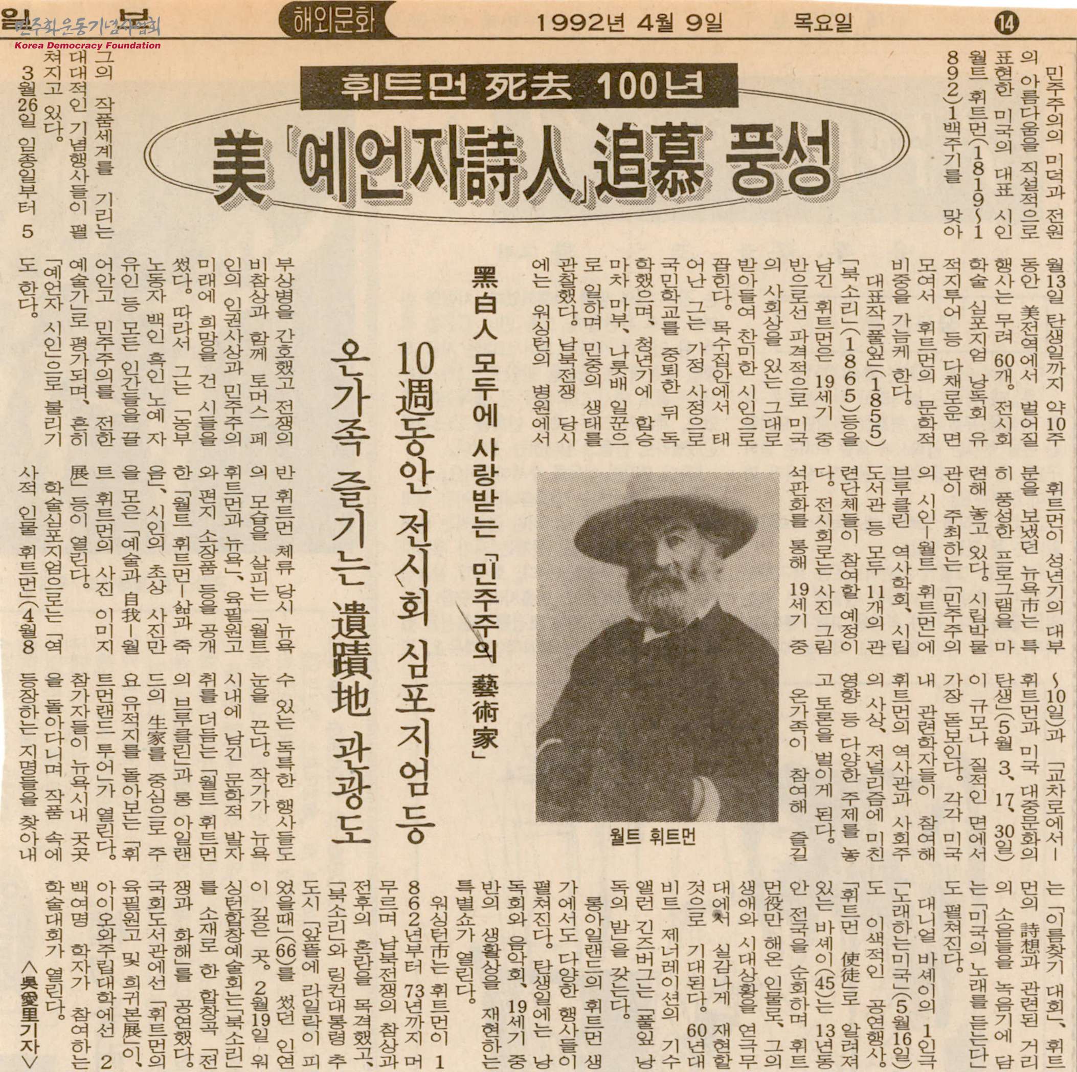 - 민주주의의 미덕과 전원의 아름다움을 직설적으로 표현한 미국의 대표 시인 월트 휘트먼 100주기를 맞아 그의 작품세계를 기리는 대대적인 기념행사를 펼치고 있다는 내용의 신문스크랩으로, 3월 26일 임종일부터 5월 13일 탄생일까지 약 10주 동안 미 전역에서 60개의 전시회, 학술 심포지엄, 낭독회 등 다양한 행사가 이루어질 예정임
