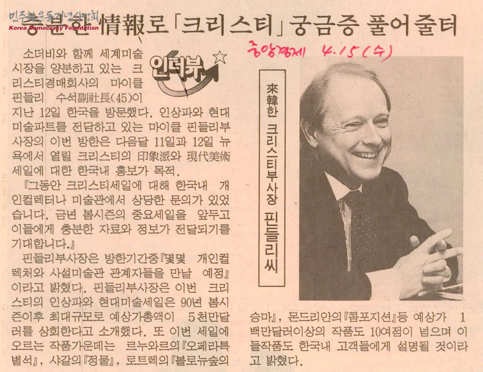 - 소더비와 함께 세계미술 시장을 양분하고 있는 크리스티경매회사의 마이클 핀들리 수석부사장이 한국을 방문한 내용의 신문스크랩으로, 그동안 크리스티세일에 대해 한국내 개인컬렉터나 미술관에서 상당한 문의가 있었고 금년 봄 시즌의 중요 세일을 앞두고 이들에게 충분한 자료와 정보가 전달되기를 기대한다고 함