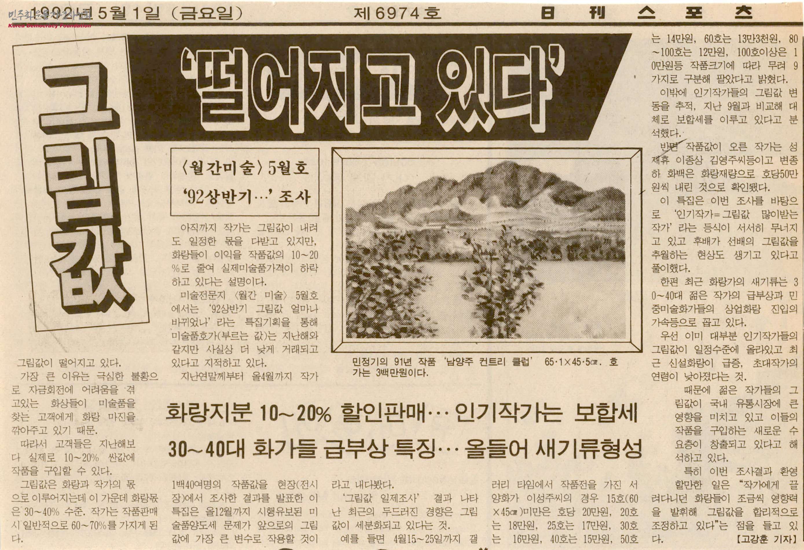 - 극심한 불황으로 자금 회전에 어려움을 겪고 있는 화랑들이 미술품을 찾는 고객에게 화랑 마진을 깎아주면서 떨어지는 그림값에 대한 내용을 <월간미술> 5월 호의 조사자료를 인용하여 설명한 신문스크랩