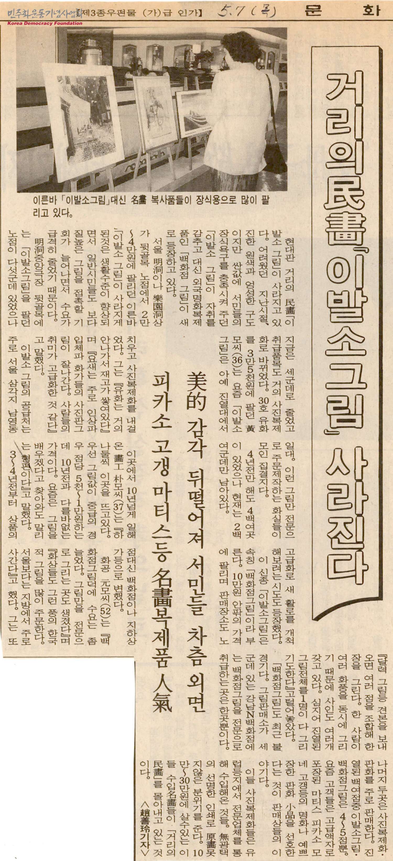 - 「이발소 그림」이 사라지고 피카소, 고갱, 마티스 등 명화 복제품들의 인기가 늘어났다는 내용의 신문스크랩으로, 일반시민들의 생활수준이 향상됨에 따라 보다 질 높은 그림을 접할 기회가 많아져 상대적으로 싼값에 팔리던 「이발소 그림」이 수요가 줄게 되어 사라졌다고 말함