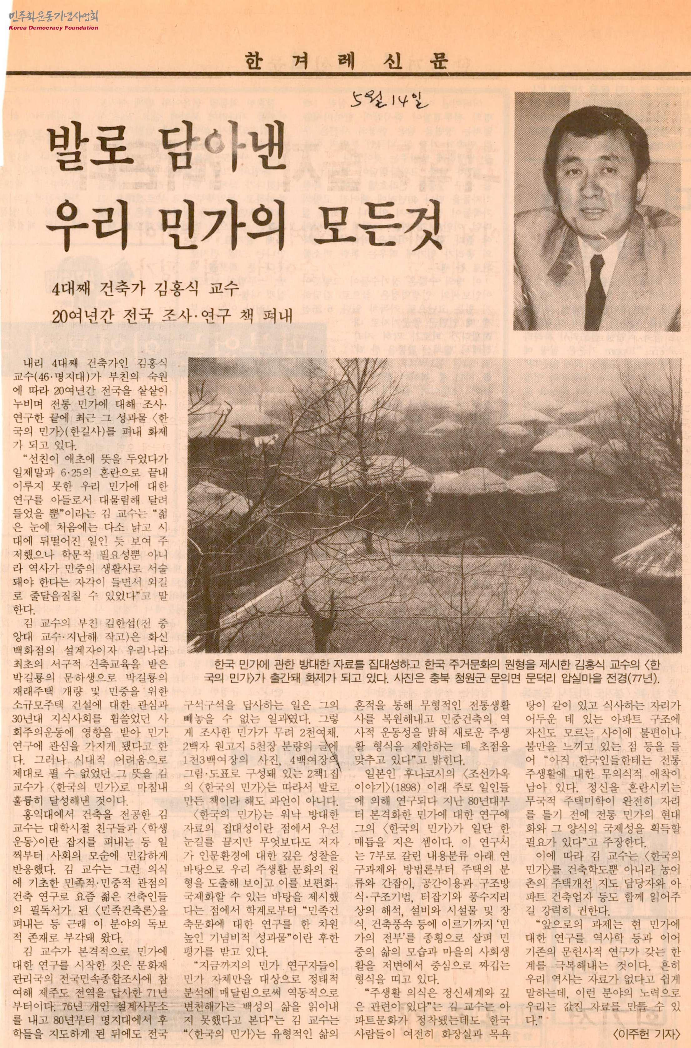 - 4대째 건축가인 명지대 김홍식 교수가 부친의 숙원에 따라 20여 년간 전국을 샅샅이 누비며 전통 민가에 조사한 끝에 펴낸 「한국의 민가」에 대한 신문스크랩으로, 워낙 방대한 집대성이란 점에서 눈길이 끌지만 무엇보다 저자가 인문환경에 대한 깊은 성찰을 바탕으로 우리 주생활 문화의 원형을 도출해 보이고 이를 보편화·국제화할 수 있는 바탕을 제시했다는 점에서 학계에 기념비적 성과물이라는 후한 평가를 받고 있음