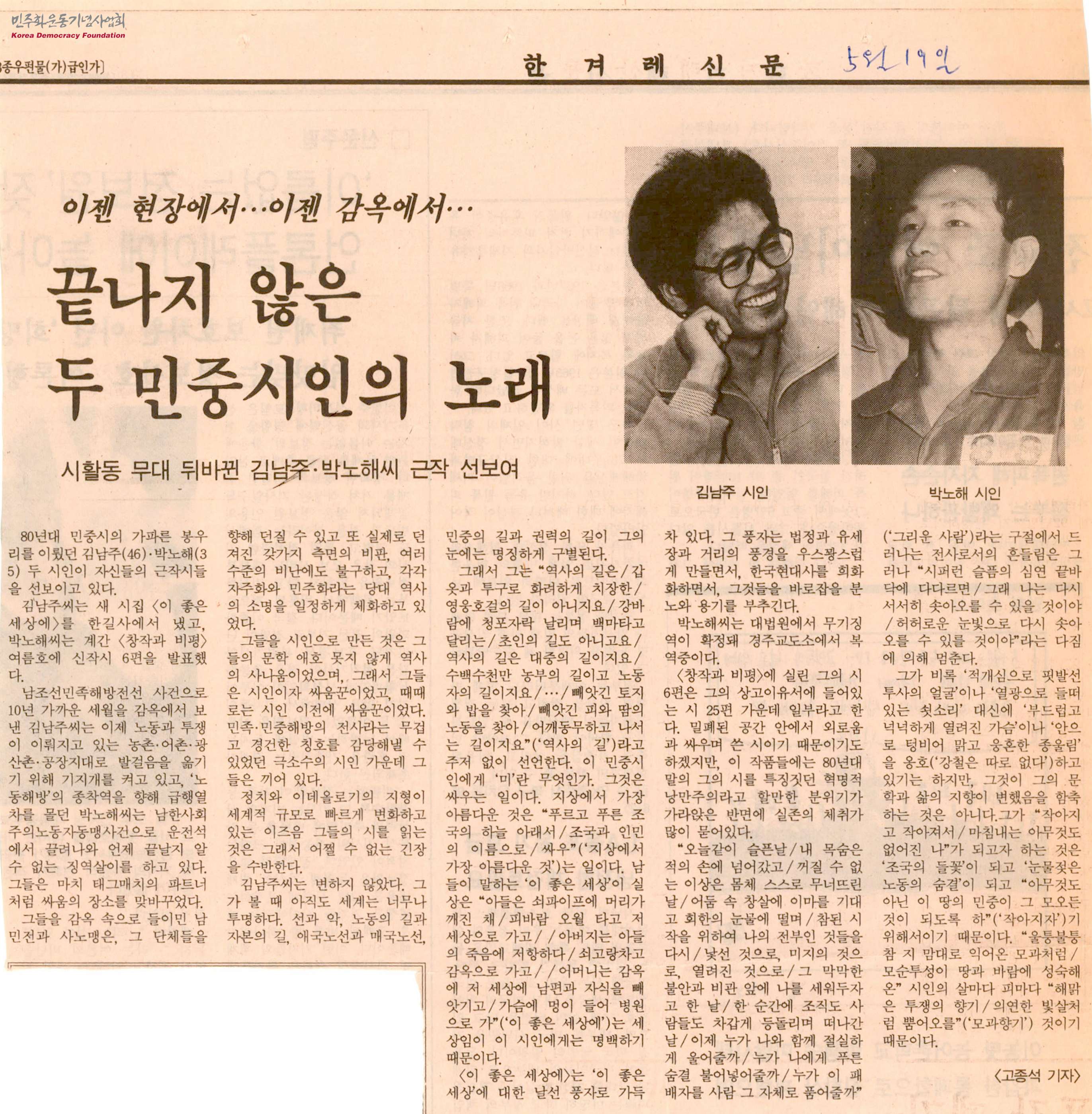 - 80년대 민중시의 가파른 봉우리를 이뤘던 김남주·박노해 두 시인이 근작시를 발표했다는 내용을 담고 있는 신문스크랩으로, 김남주씨는 새 시집 <이 좋은 세상에>를 한길사에서 냈고, 박노해씨는 계간 <창작과 비평> 여름호에 신작시 6편을 발표함