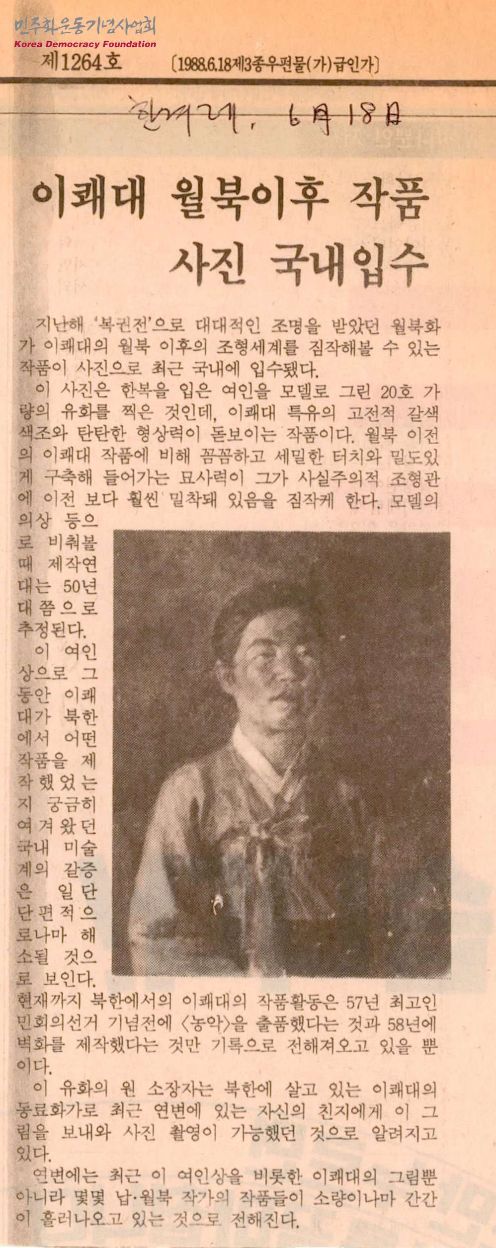 - 지난해 「복권전」으로 대대적인 조명을 받았던 월북화가 이쾌대의 월북 이후 조형세계를 짐작해 볼 수 있는 작품이 사진으로 최근 국내에 입수되었다는 내용의 신문스크랩으로, 사진은 한복을 입은 여인을 모델로 그린 20호 가랑의 유화를 찍은 것인데, 이쾌대 특유의 고전적 갈색 색조와 탄탄한 형상력이 돋보이는 작품임