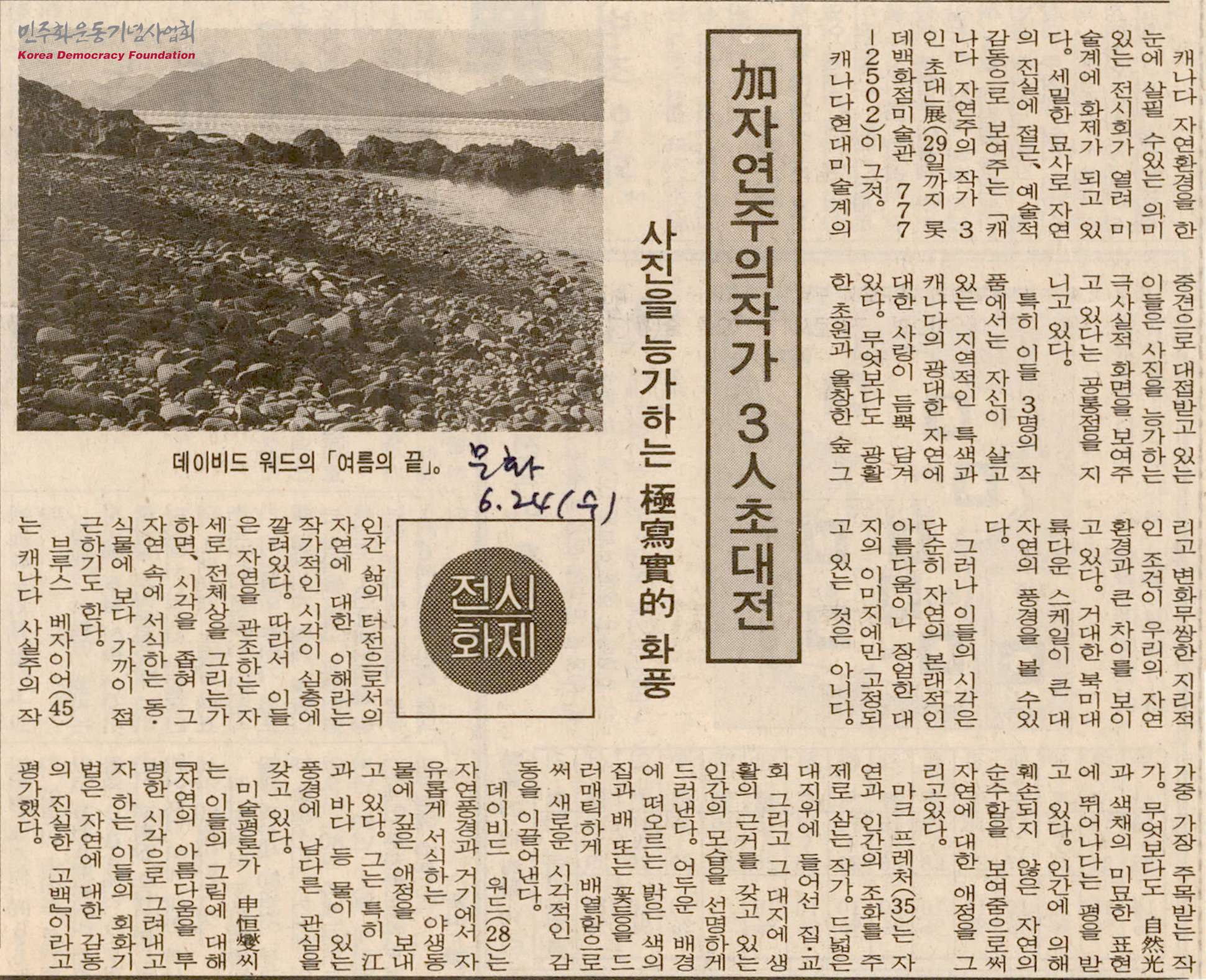 [신문스크랩]加(가)자연주의작가 3人(인) 초대전-사진을 능가하는 極蕮實的(극사실적) 화풍