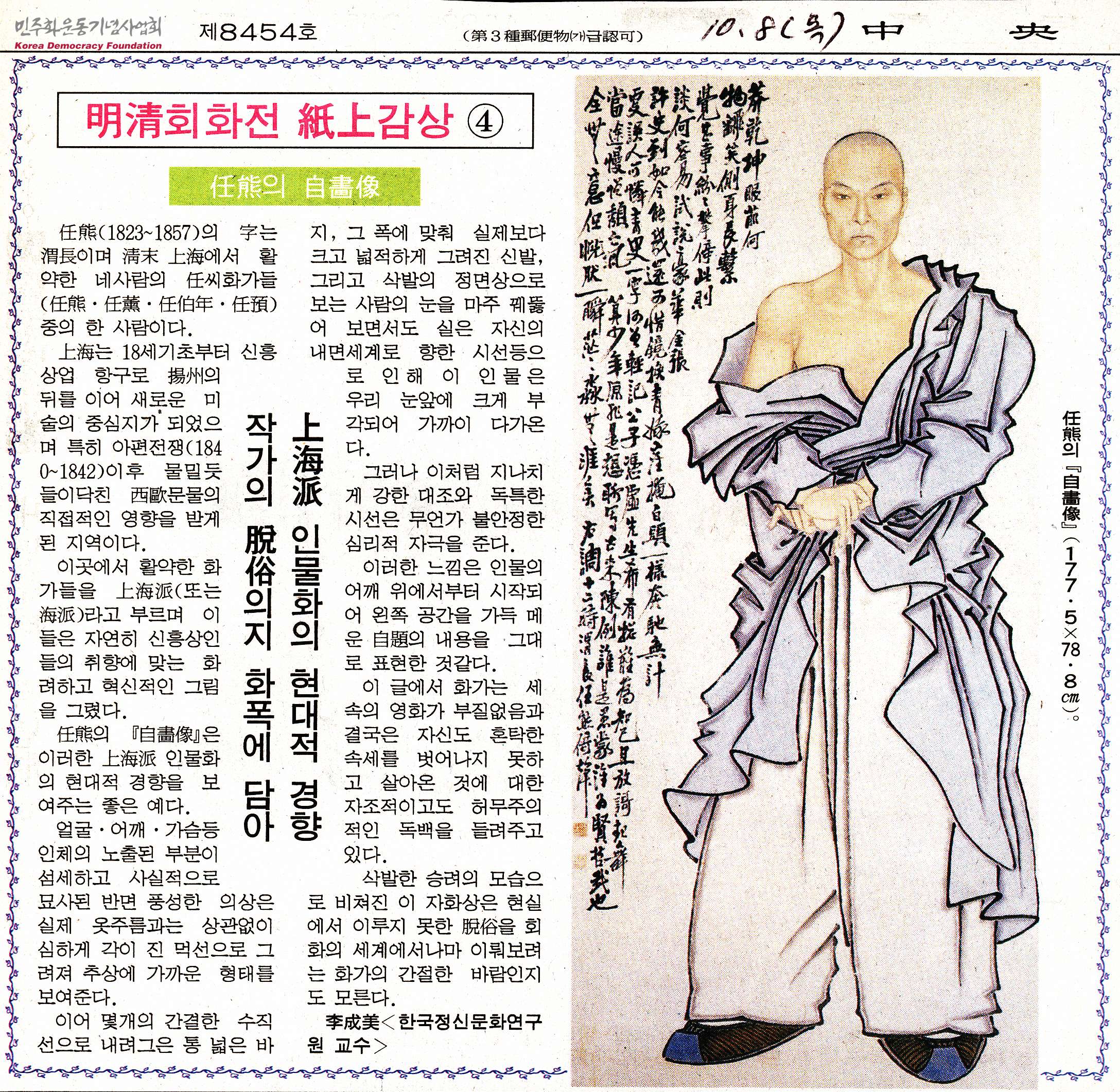 [신문스크랩]明淸(명청)회화전 紙上(지상)감상④-任熊(임웅)의 自畵像(자화상)