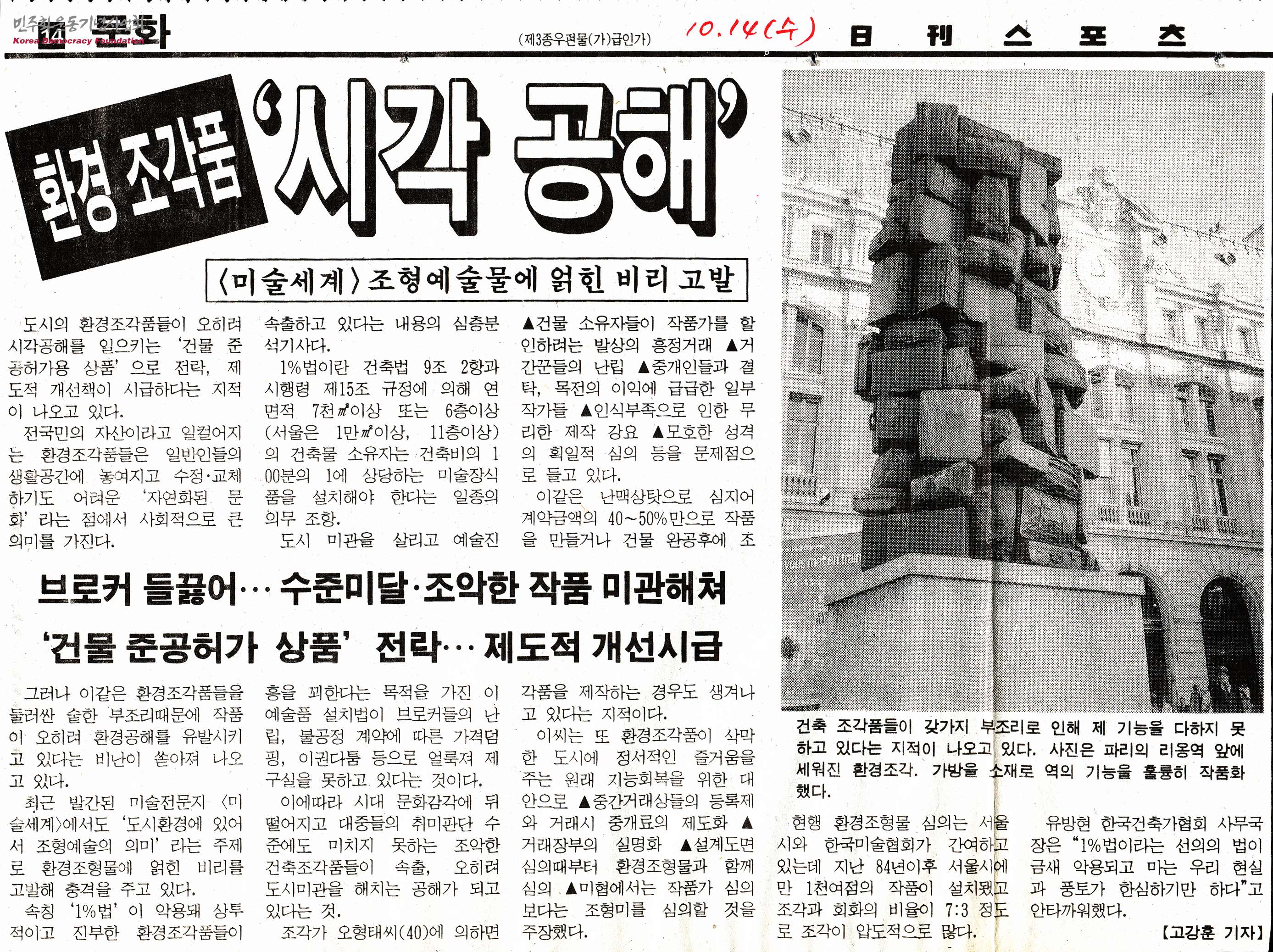 - 도시의 환경조각품들이 오히려 시각공해를 일으키는 '건물 준공허가용 상품'으로 전락하여 제도적 개선책이 시급하다는 지적이 나오고 있으며, 최근 발간된 미술전문지 '미술세계'에서도 도시환경에 있어서 조형예술의 의미'라는 주제로 환경조형물에 얽힌 비리를 고발해 충격을 주고 있다는 내용 등이 담긴 신문스크랩