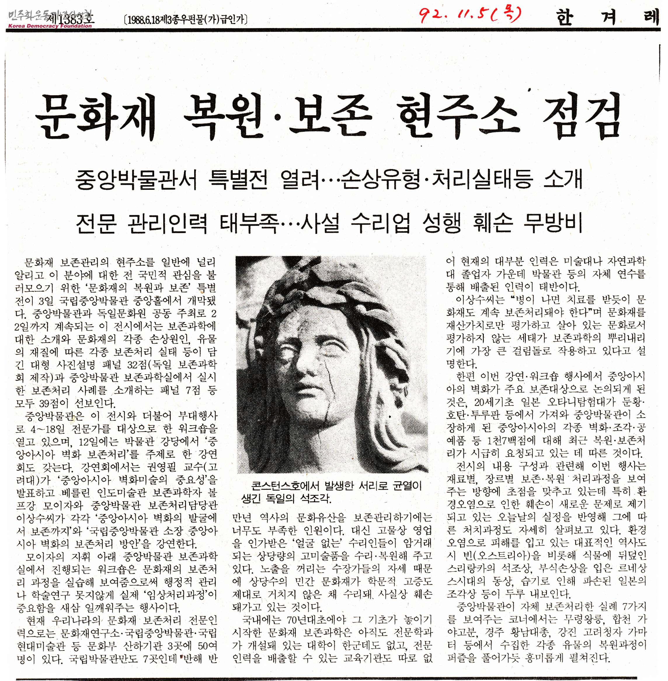 - 「문화재의 복원과 보존 특별전」이 1992년 11월 3일 국립중앙박물관 중앙홀에서 개막되며 중앙박물관과 독일문화원 공동 주최로 22일까지 진행되는 전시는 보존과학에 대한 소개와 문화재의 각종 손상원인, 유물의 재질에 따른 각종 보존처리 실태 등이 담긴 대형 사진설명 패널 32점과 중앙박물관 보존과학실에서 실시한 보존처리 사례를 소개하는 패널 7점 등 39점을 선보이며 이 전시와 더불어 부대행사로 4일부터 18일까지 전문가를 대상으로 한 워크숍 등을 연다는 내용의 신문스크랩