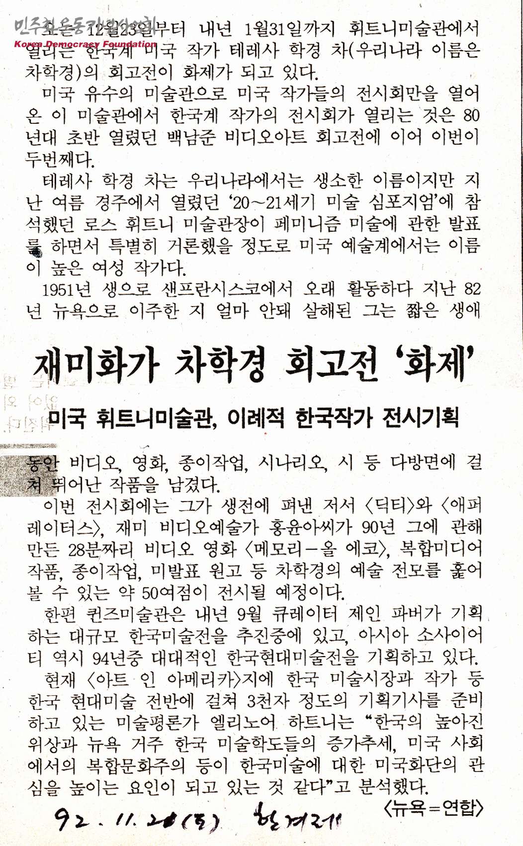 - 1992년 12월 23일부터 1993년 1월 31일까지 휘트니미술관에서 열리는 한국계 미국 작가 테레사 학경 차의 회고전에 대한 기사로 휘트니미술관에서 한국계 작가의 전시회가 열리는 것은 백남준 비디오아트 회고전 이후 두번째로 복합미디어작품, 종이작업, 미발표 원고 등 작가의 작품 50여점이 전시될 예정이라는 내용의 신문스크랩