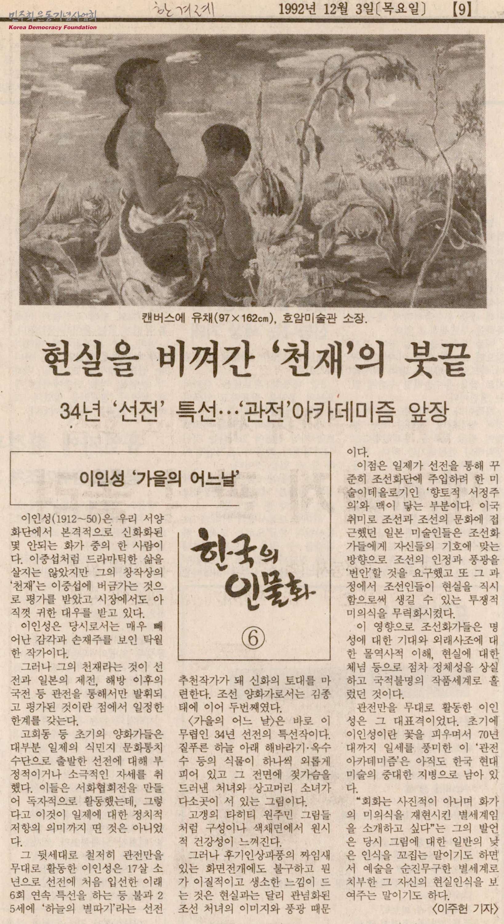 [신문스크랩]한국의 인물화⑥-이인성 '가을의 어느날'
