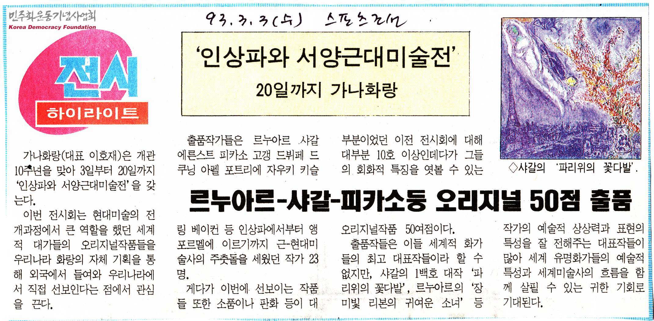 - 가나화랑은 개관 10주년을 맞아 3월 3일부터 20일까지 '인상파와 서양근대미술전'을 갖게 되었으며, 이 전시회는 현대미술의 전개과정에서 큰 역할을 했던 세계적 대가들의 오리지널 작품들을 우리나라 화랑의 자체 기획을 통해 외국에서 들여와 우리나라에서 직접 선보인다는 내용의 신문스크랩