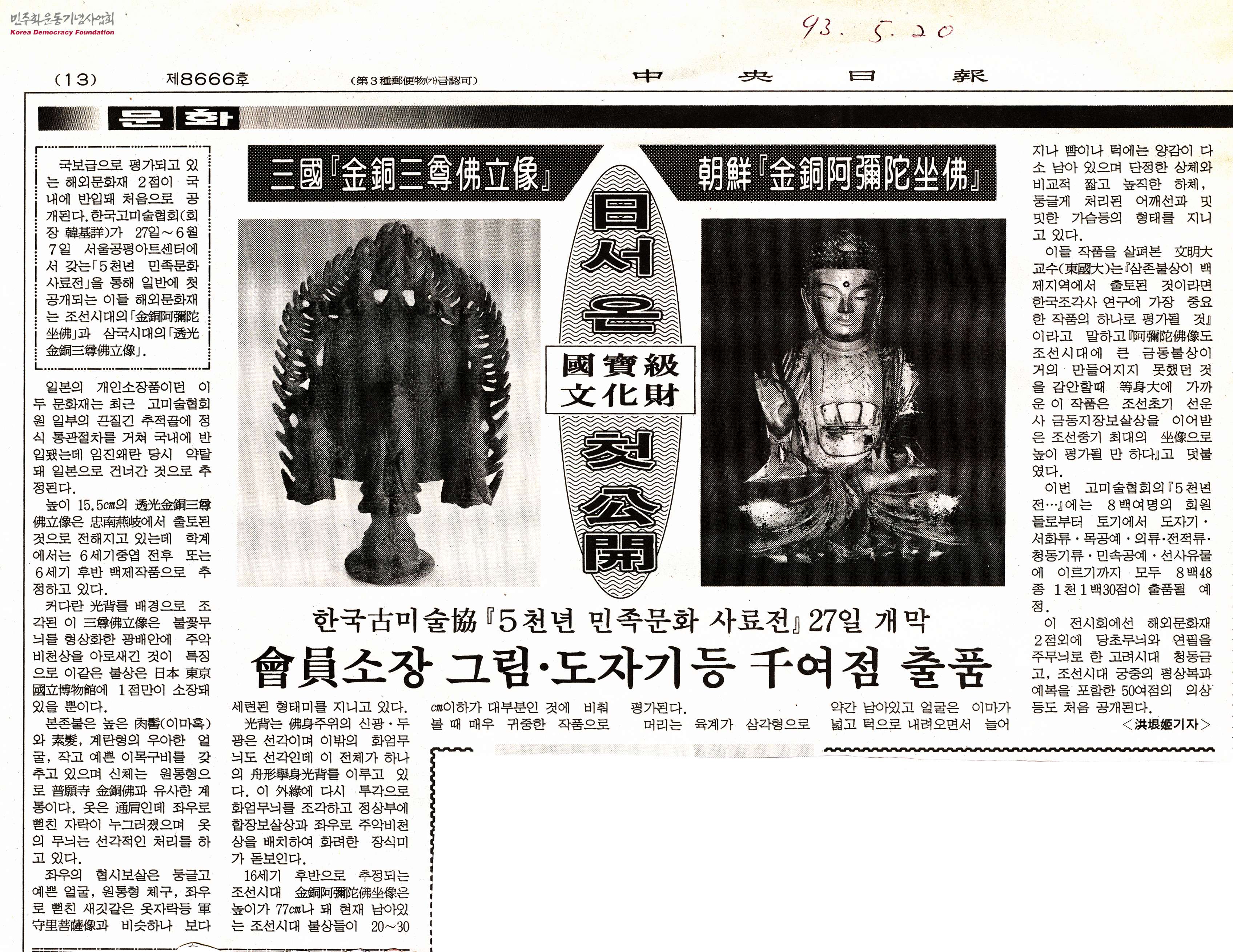 - 국보급으로 평가되고 있는 해외 문화재 2점, 조선시대의 '금동가미타좌불'과 삼국시대의 '투광금동삼존불립상'이 국내에 반입되어, 한국고미술협회는 5월 27일부터 6월 7일까지 서울공평아트센터에서 '5천년 민족문화 사료전'을 통해 일반에 최초로 공개한다는 내용의 신문스크랩