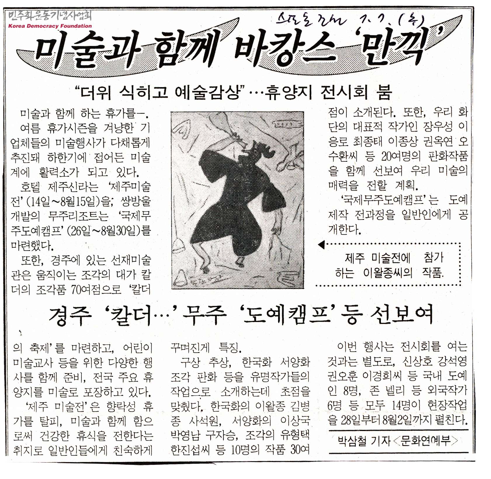 - 여름 휴가시즌을 겨냥한 기업체들의 미술행사가 다채롭게 추진돼 미술계가 활력을 되찾고 있는데, 1993년 7월 14일부터 8월 15일까지 호텔 제주신라에서 열리는 '제주미술전', 7월 26일부터 8월 30일까지 쌍방울 개발의 무주리조트에서 열리는 '국제무주도예캠프', 경주 선재미술관의 '칼더의 축제' 등이 바로 그것이라는 내용의 신문스크랩