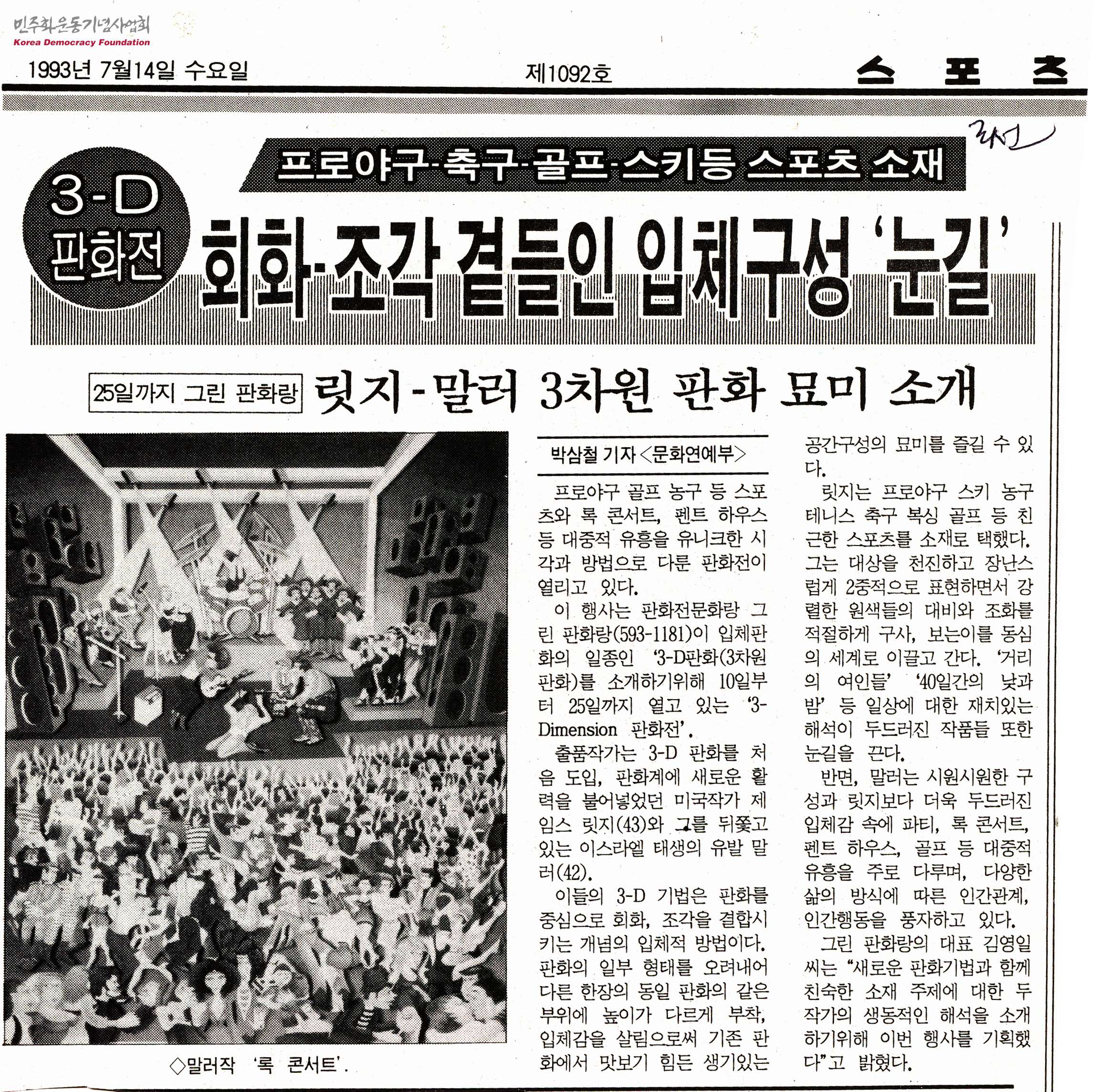 - 프로야구, 골프, 농구 등 스포츠와 락 콘서트, 펜트하우스 등 대중적 유흥을 유니크한 시각과 방법으로 다룬 판화전, '3-Dimension 판화전'이 1993년 7월 25일까지 그린판화랑에서 열리고 있으며, 미국작가 제임스 릿지와 이스라엘 태생의 유발 말러가 출품 작가로 참여하였다는 내용 등이 담긴 신문스크랩