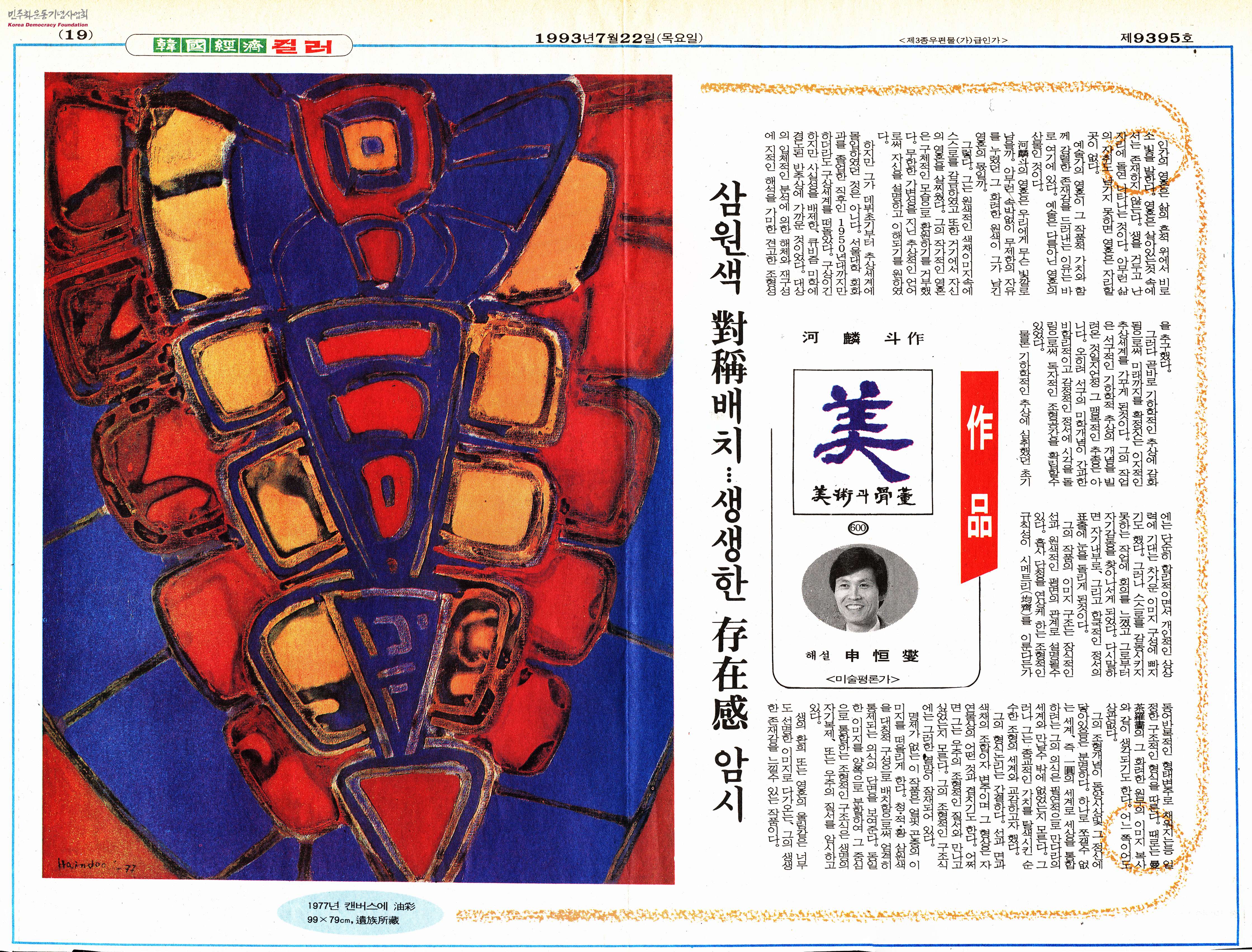 [신문스크랩]河麟斗作(하인두작) 삼원색 對稱(대칭)배치∙∙∙생생한 存在感(존재감) 암시