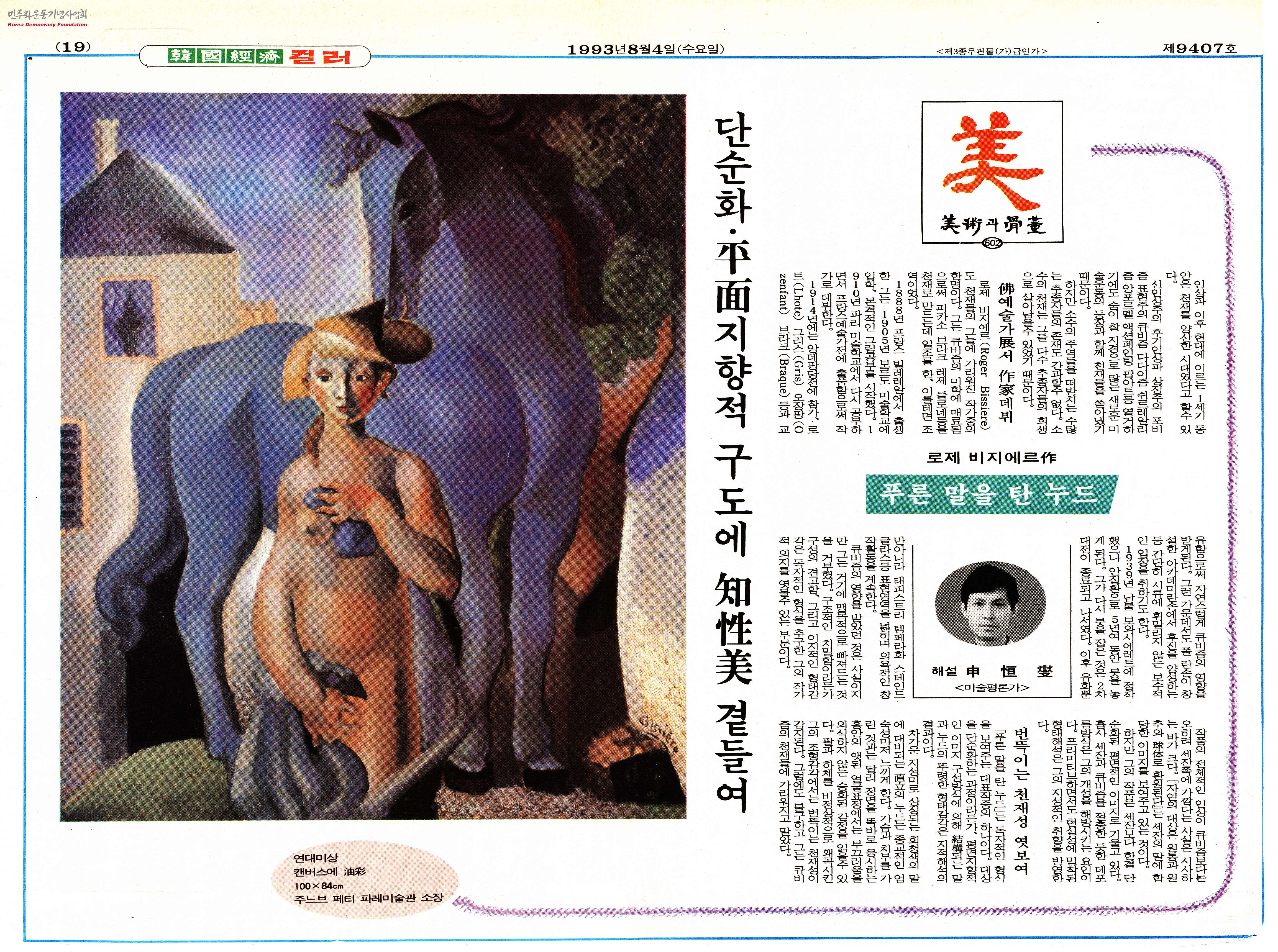 [신문스크랩]로제 비지에르作(작) 푸른 말을 탄 누드