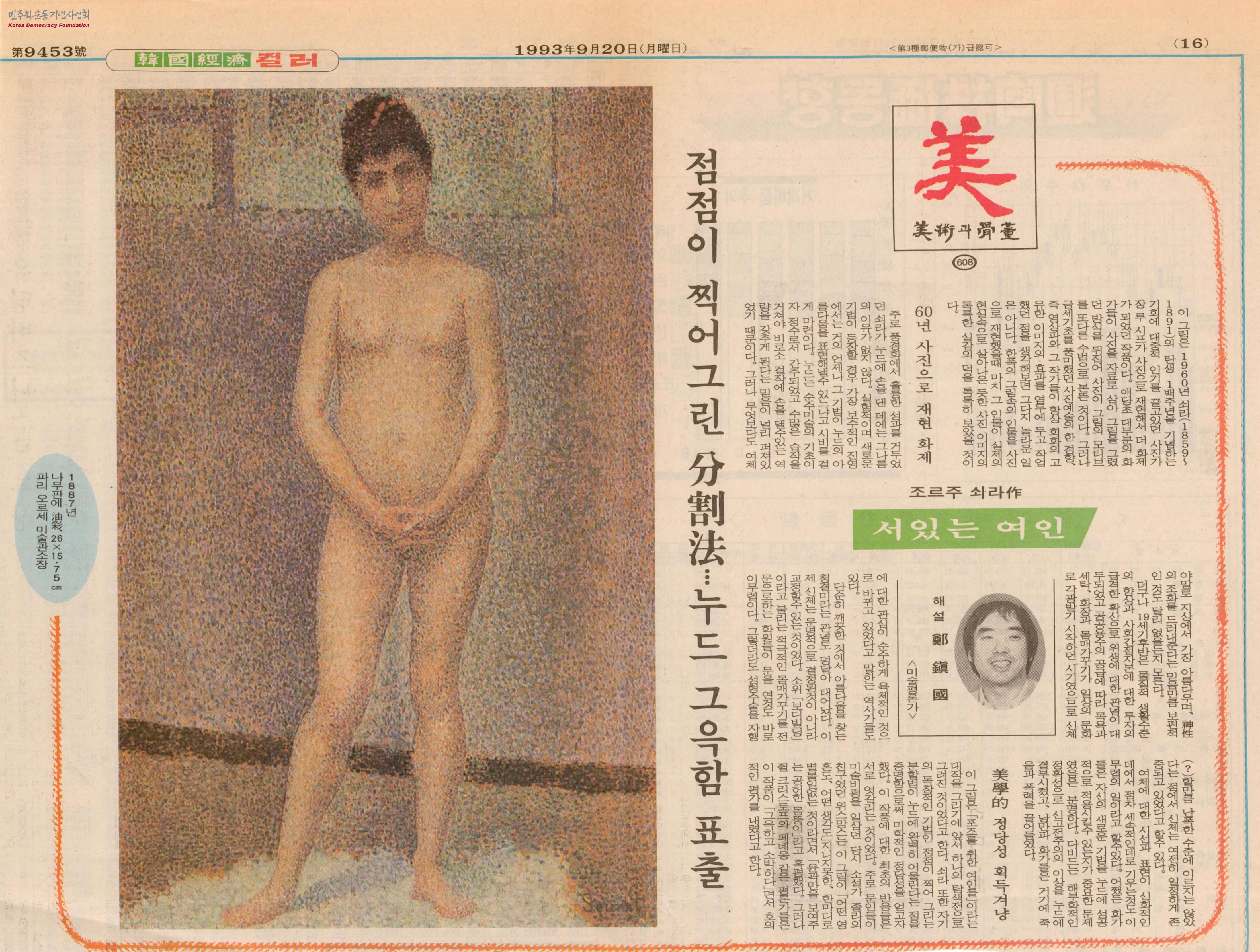 - 1960년 조르주 쇠라의 탄생 1백 주년을 기념하여 사진가 장 루 시프가 사진으로 재현해서 화제가 된 작품인 '서있는 여인'에 대해 미술평론가 정진국의 설명이 담겨있는 신문스크랩
