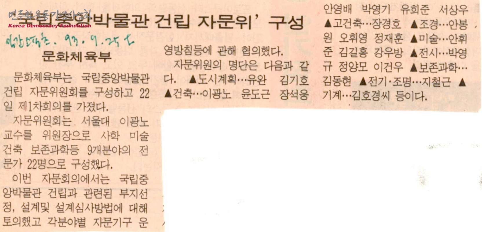 - 문화체육부는 국립중앙박물관 건립 자문위원회를 구성하였고, 9월 22일 제1차회의를 가졌으며 자문위원회는 서울대 이광노 교수를 위원장으로 사학 미술 건축 보존과학 등 9개 분야의 전문가 22명으로 구성하였으며 이를 통한 국립중앙박물관 건립 관련 분야에 대한 토의를 진행하였다는 내용의 신문스크랩