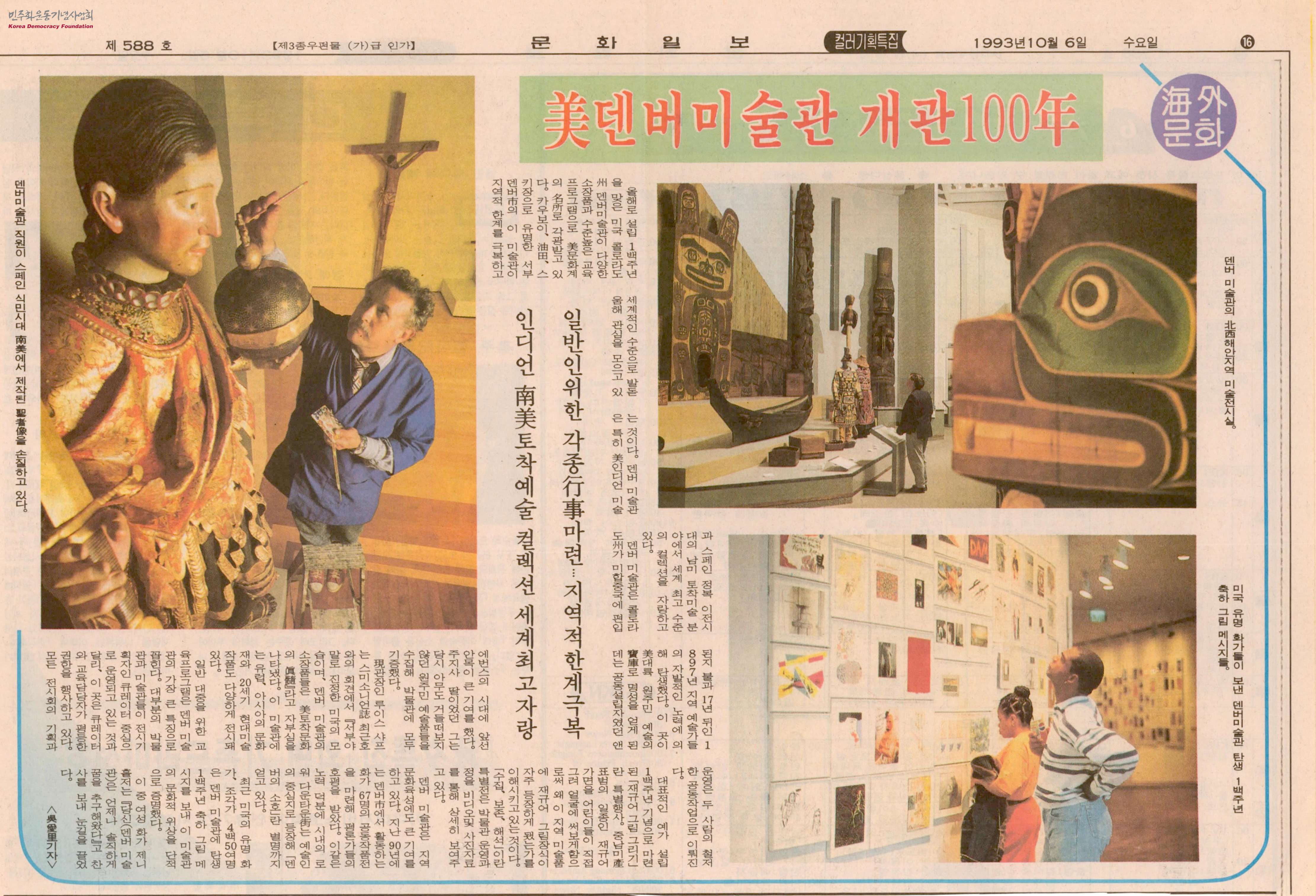 - 개관 100주년을 맞은 미국 콜로라도주 덴버미술관이 서부의 지역적 한계를 극복하고 미 문화계에서 수준 높은 교육과 다양한 소장품으로 미술계 명소로 각광받고 있다는 내용과 백주년 기념행사에 대한 내용이 담긴 신문스크랩