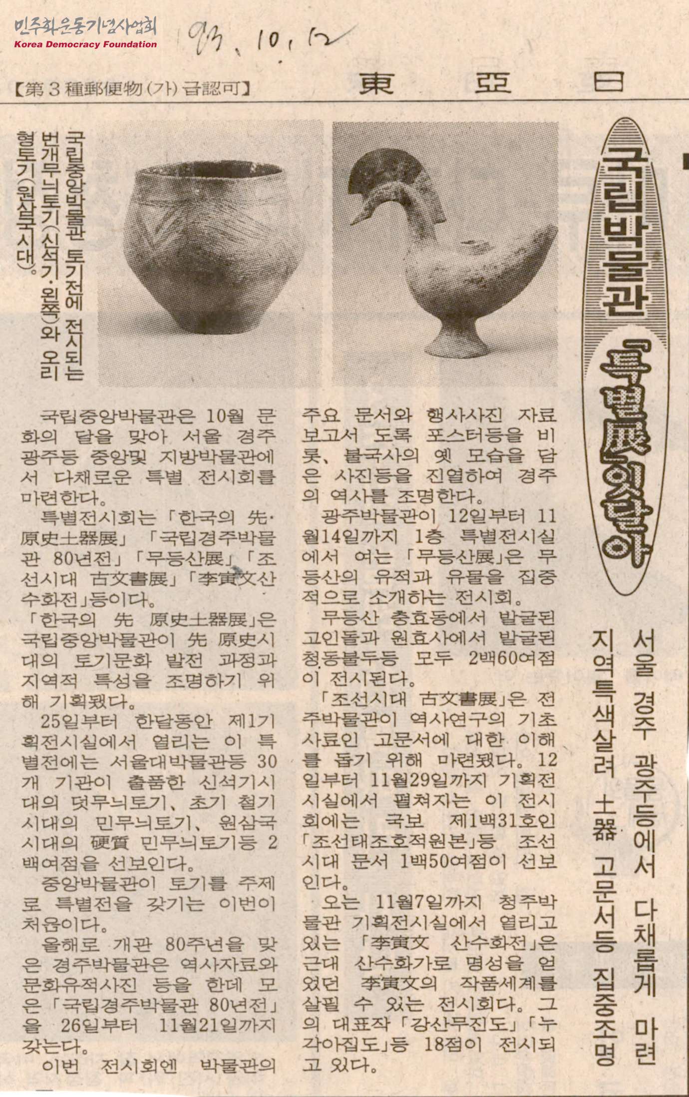 - 국립중앙박물관에서 문화의 달을 맞아 서울을 비롯한 경주 등의 박물관에서 특별 전시회를 마련하였고 서울에서는 토기문화 발전 과정과 지역적 특성을 살펴보는 전시를 경주박물관에서는 박물관 개관 80주년을 맞아 역사자료와 문화유적사진 등을 모아 전시를 진행하였다는 내용의 신문스크랩