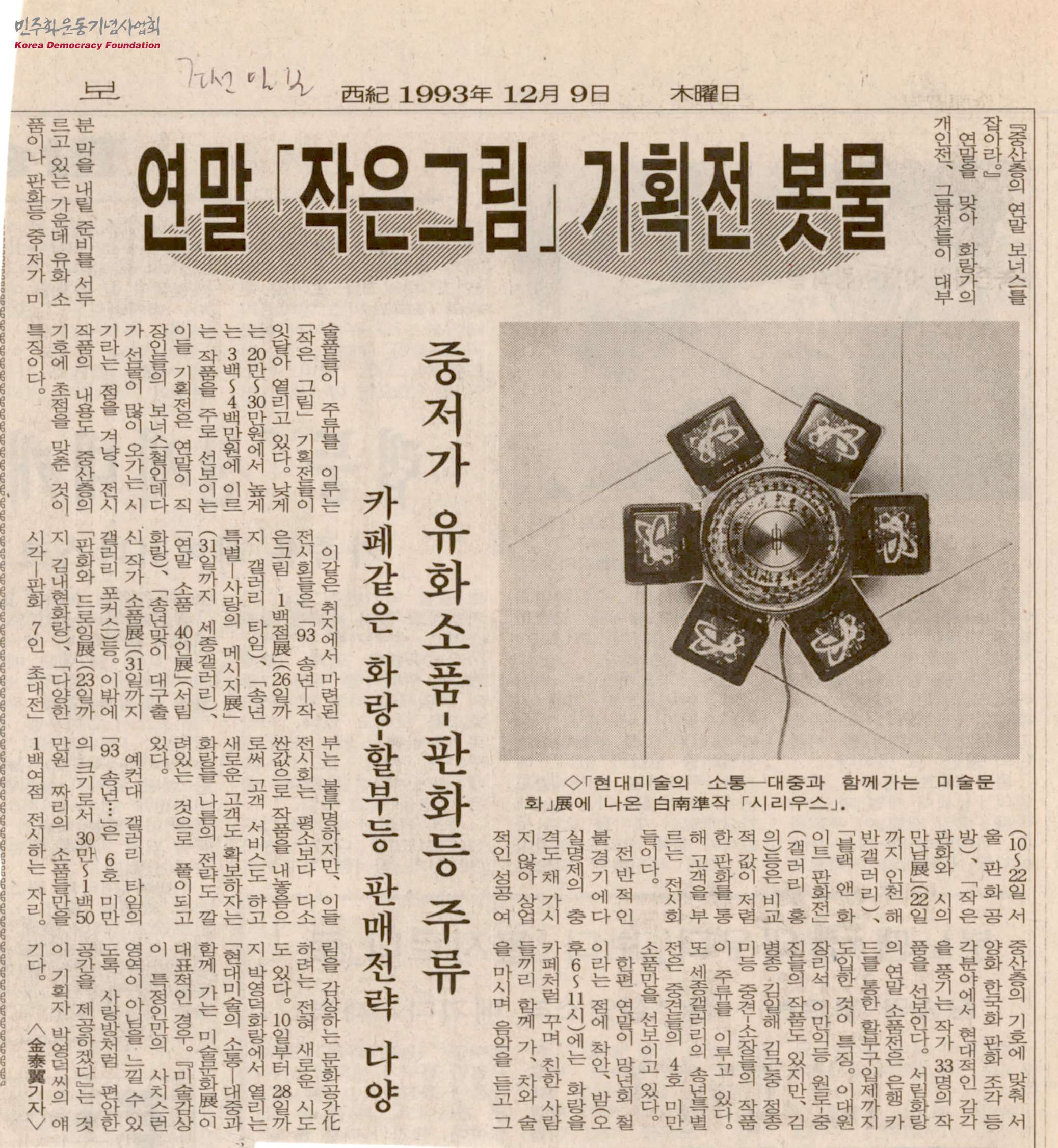 - 연말을 맞아 유화 소품이나 판화 등 중-저가 미술품들이 주류를 이루는 「작은 그림」 기획전들이 열리며 낮게는 10만 원 대에서 높게는 4백만 원에 이르는 작품을 선보이는 기획전은 직장인들의 보너스철을 맞이하여 연말 선물로 하도록 초점을 맞춘 것이라는 내용의 신문스크랩