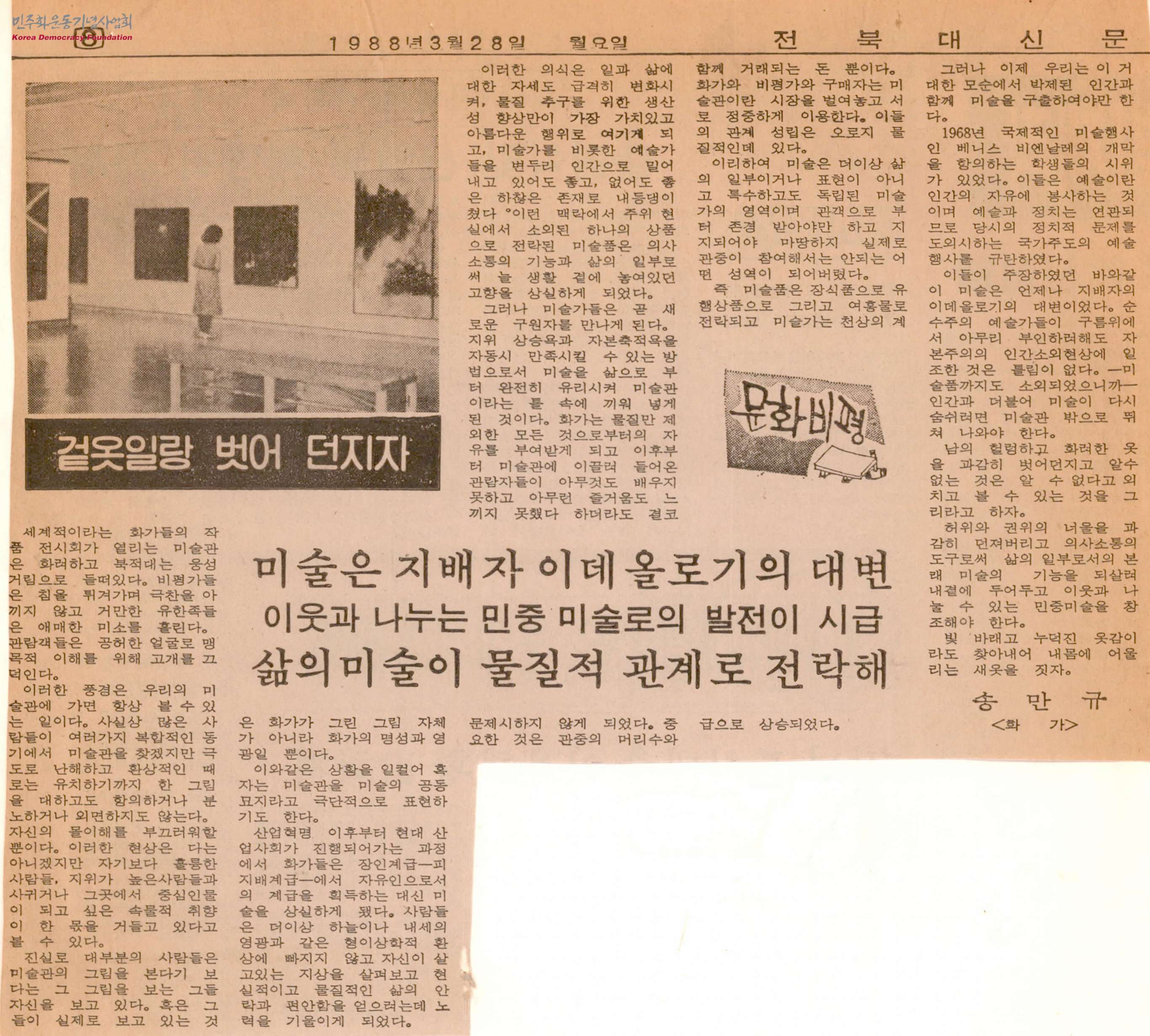 - 화가 송만규의 칼럼으로 미술관의 작품 전시회에 대해 허위와 권위의 너울을 던져버리고 의사소통의 도구로써 미술의 기능을 되살려야 되며 민중미술을 창조해야 된다는 결론의 신문스크랩