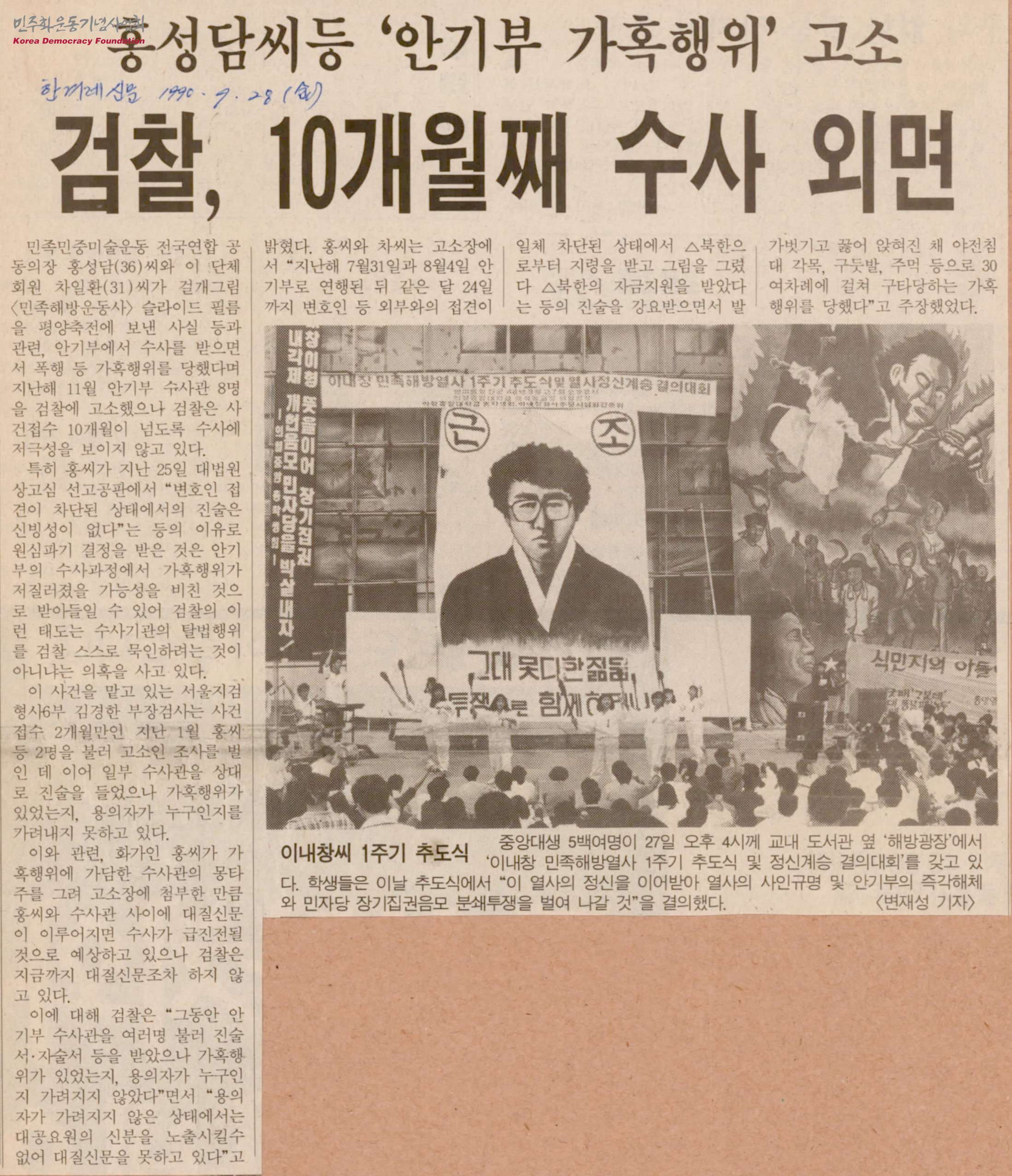 [신문스크랩]홍성담씨등 '안기부 가혹행위' 고소 검찰, 10개월째 수사 외면