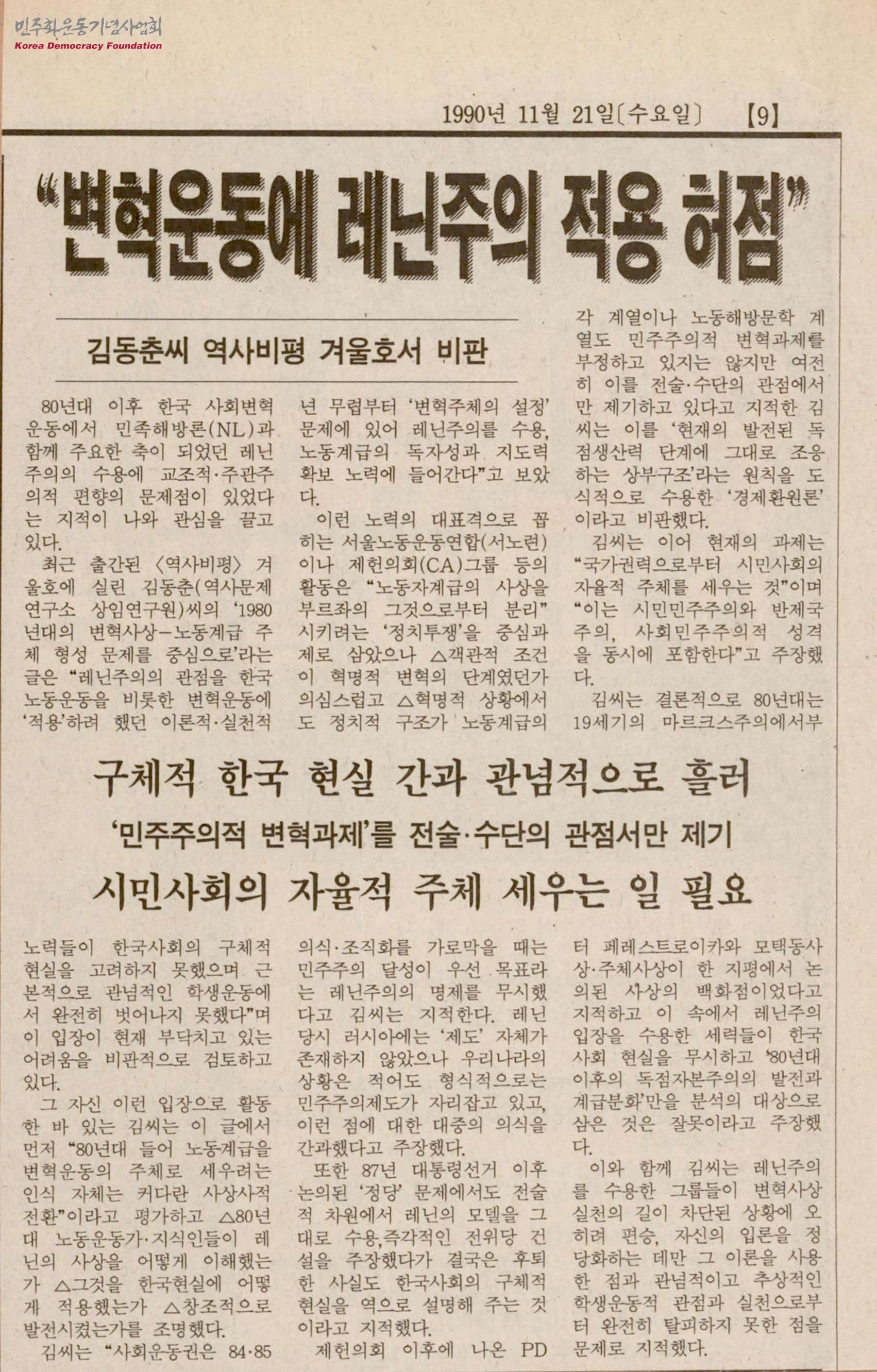 - <역사비평> 겨울호에 실린 김동준의 '1980년대의 변혁사상-노동계급 주체 형성 문제를 중심으로' 라는 글에서 레닌주의의 수용에 교조적, 주관주의적 편향의 문제점이 있었다는 내용과 김동준이 글에서 밝힌 내용에 대한 원인이 담겨있는 신문스크랩