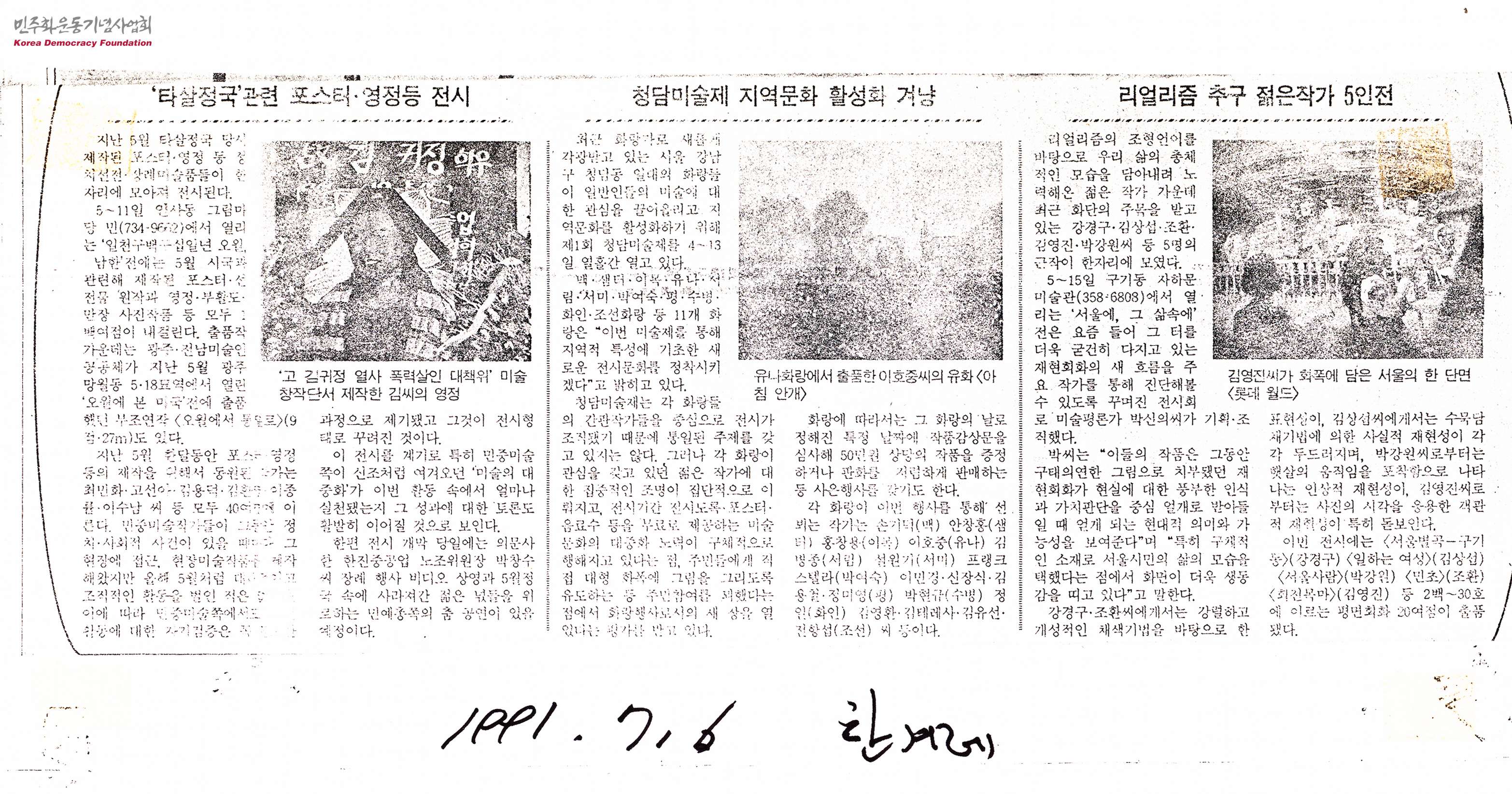 - 신문에 기재된 여러 전시회에 대한 정보를 스크랩 한 것으로, '타살정국'과 관련하여 포스터, 영정사 등 정치선전·장례 미술품들의 전시에 대한 소개, 청담미술제에 대한 의의와 취지를 밝히는 글, 리얼리즘의 조형언어를 바탕으로 우리 삶의 총체적인 모습을 담아내려 노력해온 작가 5인 전시전의 내용을 담고 있음