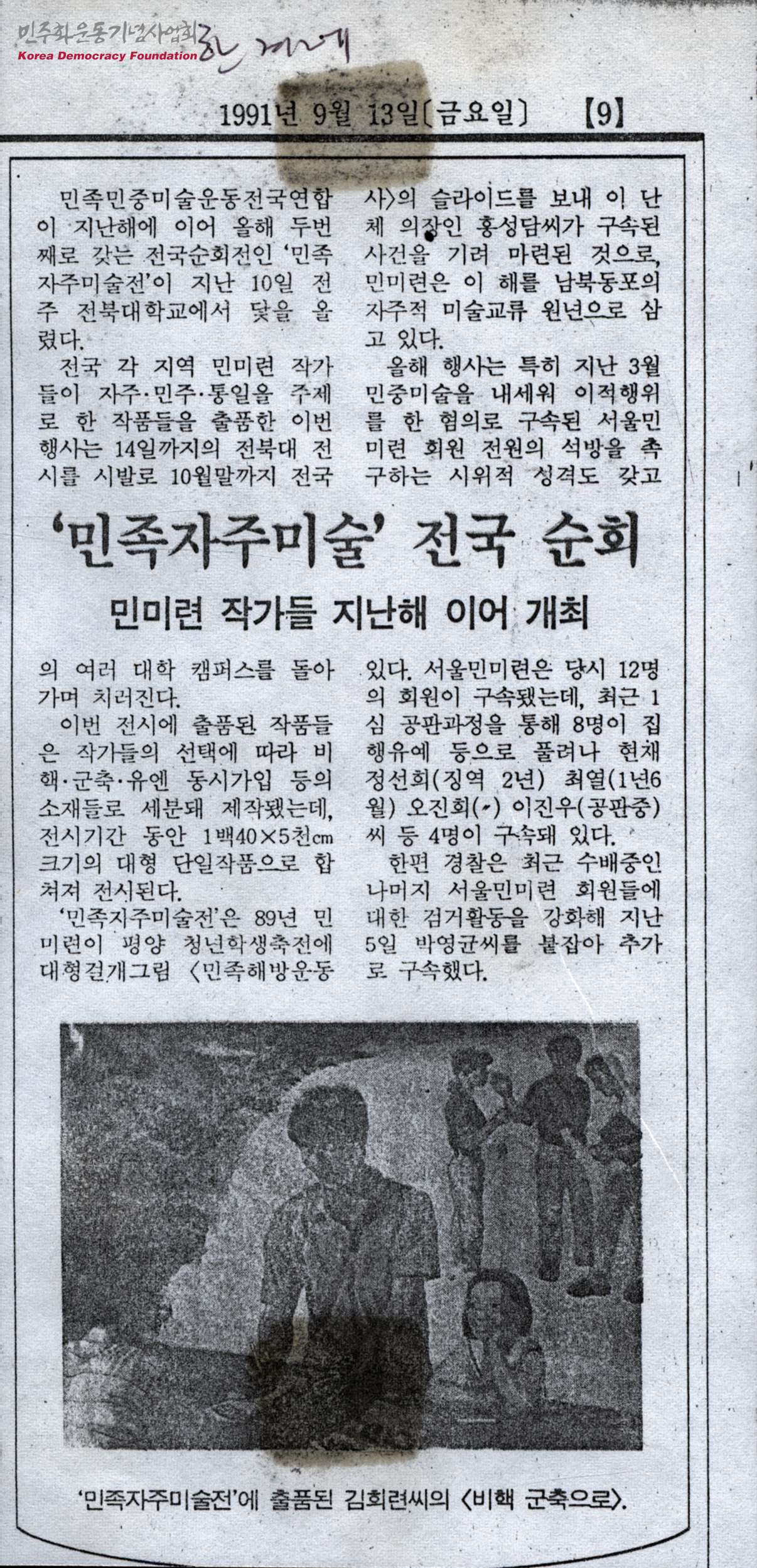 - 민족민중미술운동전국연합의 2번째 전국순회전인 '민족자주미술전' 에 대한 내용을 담은 신문스크랩으로, 해당 전시는 89년 민미련이 평양 청년학생축전에 대형걸개그림 <민족해방운동사>의 슬라이드를 보내 의장 홍성담씨가 구속된 사건을 기려 마련된 것으로, 구속된 서울민미련 회원 전원의 석방을 촉구하는 시위적 성격을 가지고 있음
