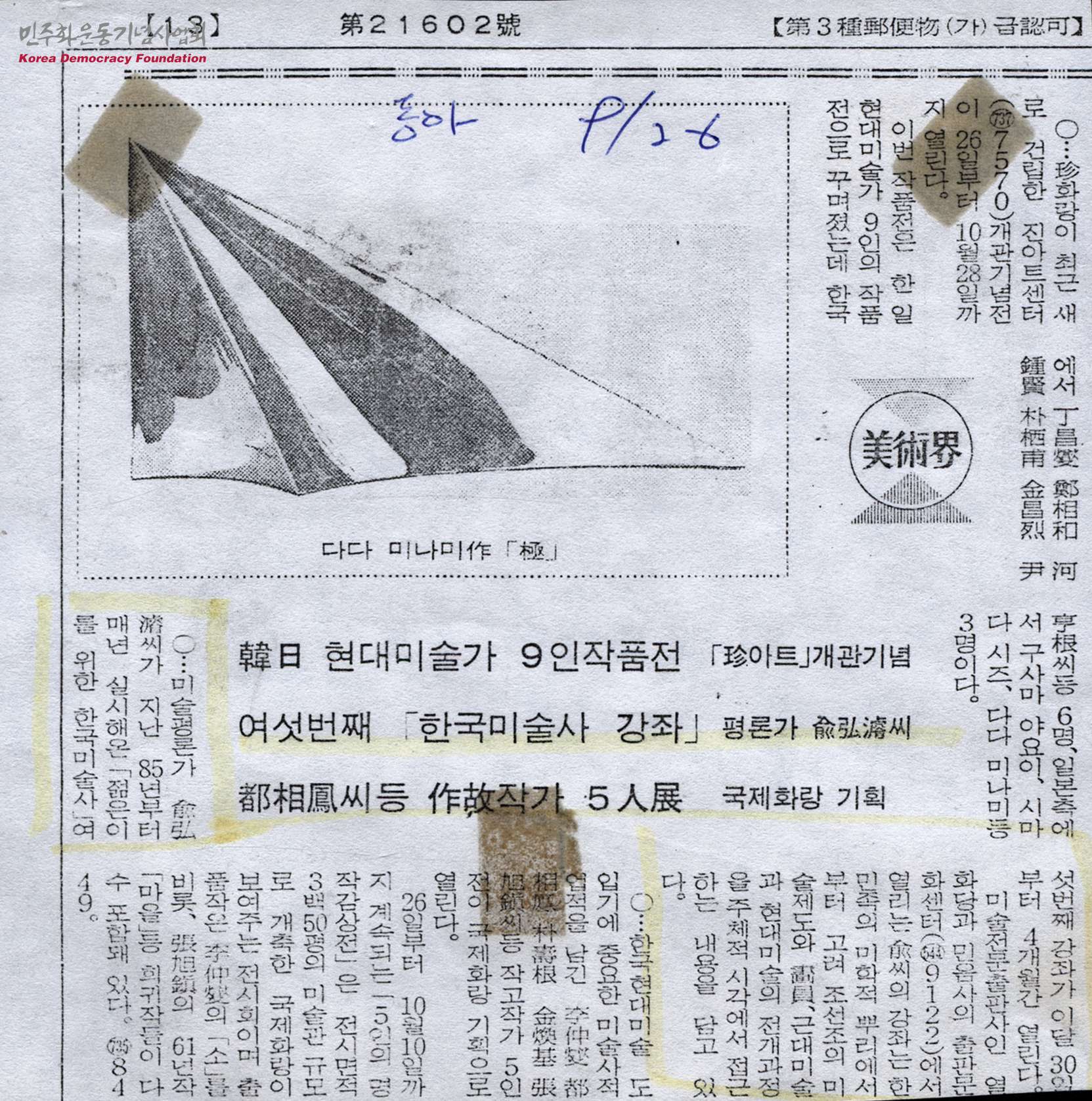 - 85년부터 6년째 이어져 오고 있는 「한국미술사 강좌」가 9월 30일부터 4개월간 열리는 것을 알리는 내용의 신문스크랩으로, 한민족의 미학적 뿌리에서부터 고려 조선조의 미술제도와 화원, 근대미술과 현대미술의 전개과정을 주체적인 시각에서 접근하는 내용을 담고 있음