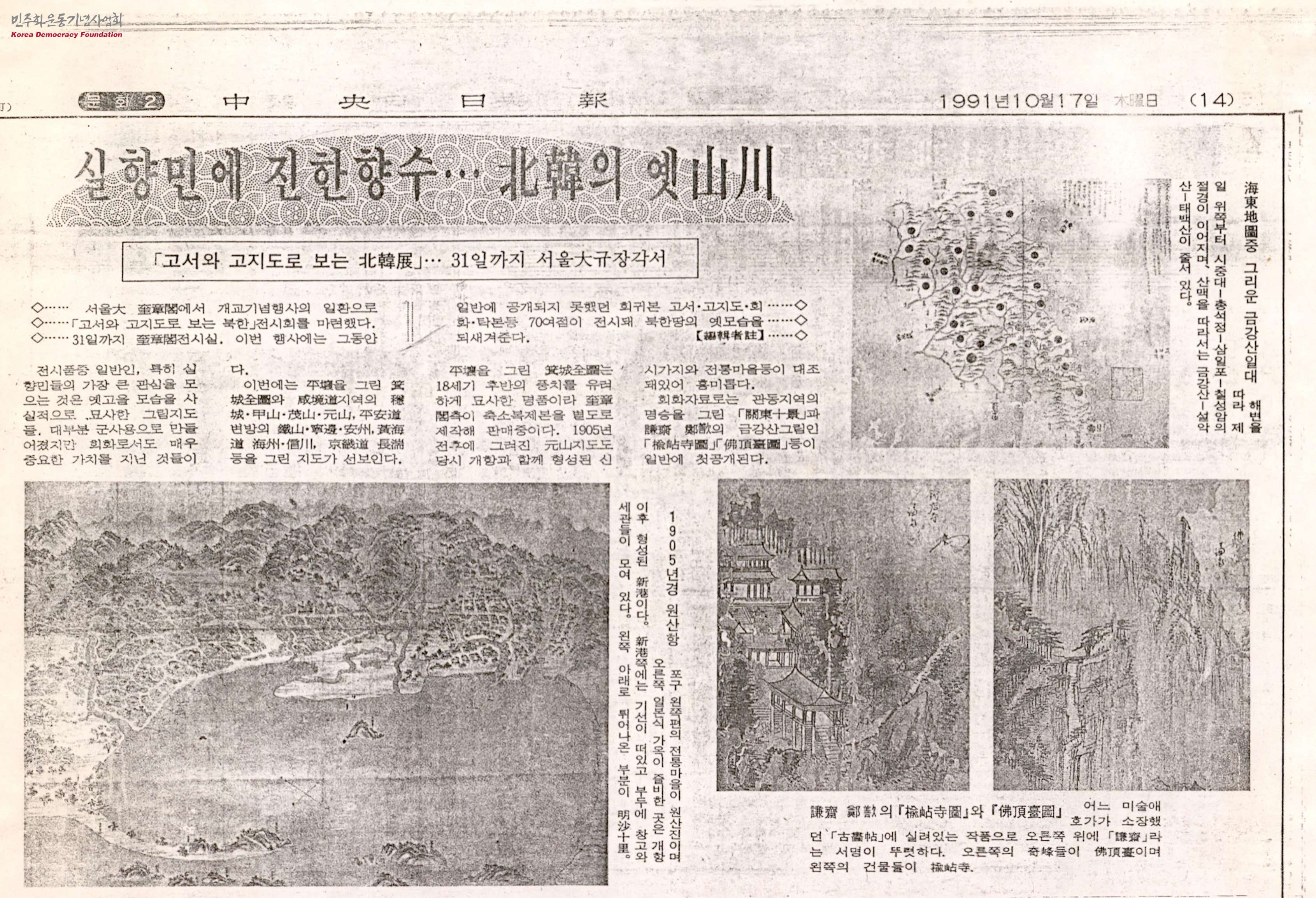 - 서울대 규장각에서 개교기념행사의 일환으로 마련한 「고서와 고지도로 보는 북한」 전시회에 관한 신문스크랩으로, 이번 행사에는 그동안 공개되지 않았던 희귀본 고서·고지도·회화·탁본등 70여 점이 전시돼 북한땅의 옛모습을 되새겨준다고 설명하고 있음