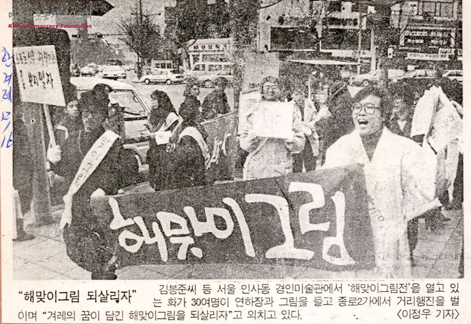 - 김봉준씨를 비롯한 여러 작가들이 서울 인사동 경인미술관에서 '해맞이그림전'을 열고 있는 내용의 사진기사 스크랩으로, 화가 30여 명의 연하장과 그림을 들고 종로2가에서 거리행동을 펼치고 있는 사진을 담음
