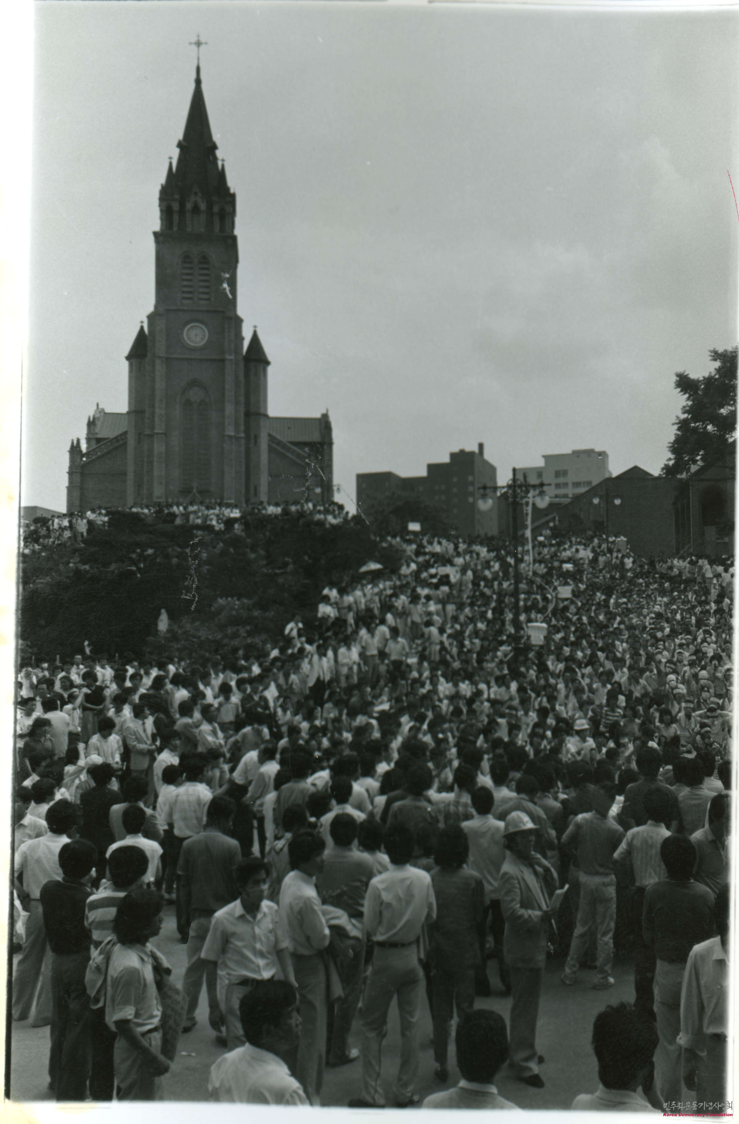 - 호헌철폐 독재타도'를 외치며 명동성당에 집결 및 행진하며 시위하는 사람들의 모습을 담은 사진