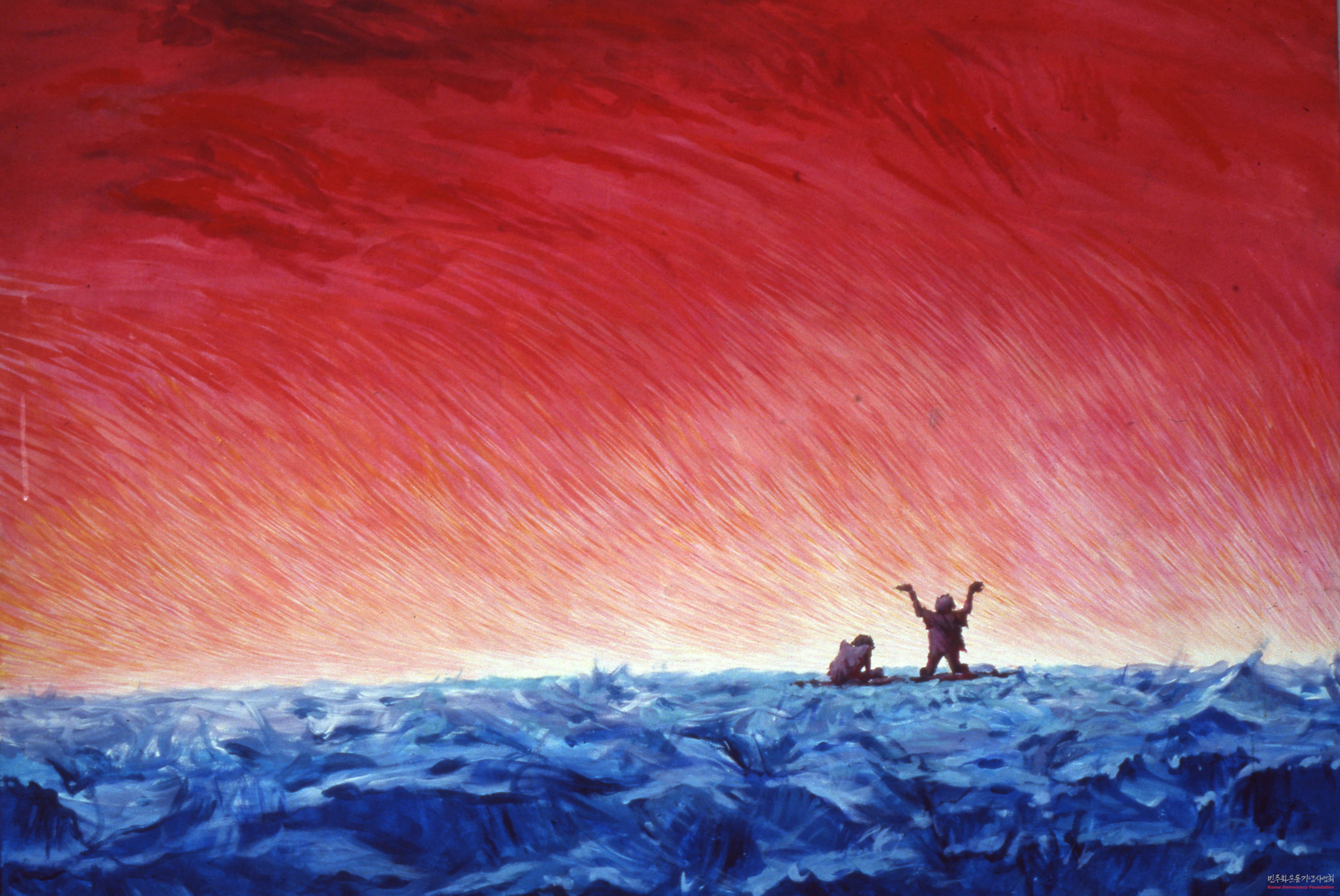 - 박영률의 작품 슬라이드 필름으로, 붉은 하늘과 파란 땅, 땅 위에 있는 사람 2명을 표현함