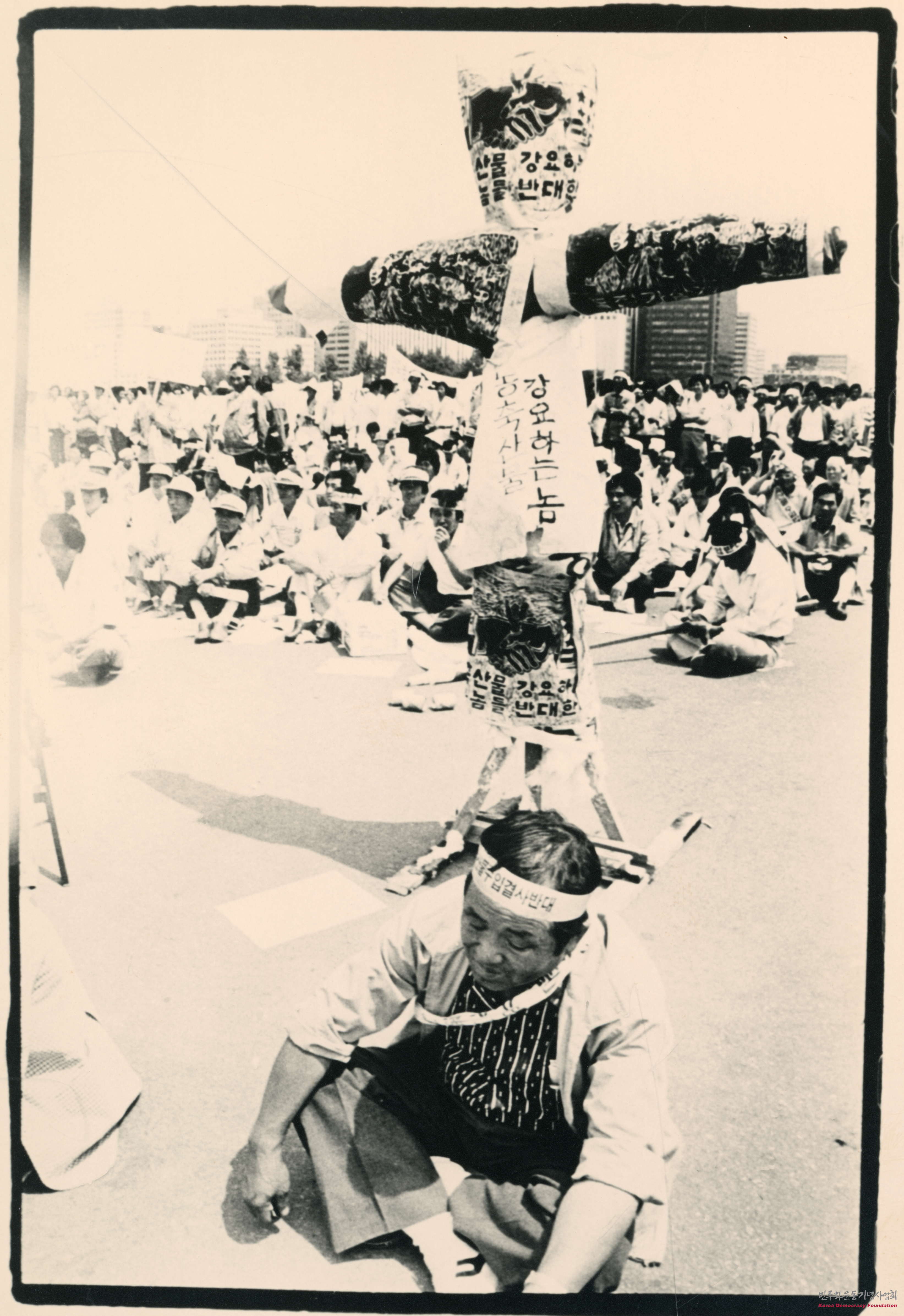 - 농산물 수입 결사반대를 주장하는 농민들이 거리에 나와 농성하는 모습이 담긴 사진으로, '농축산물 강요하는 놈'이라는 문구가 쓰여진 허수아비를 가운데에 세워 두고 주위로 농민들이 앉아 있는 모습이 담겨 있음