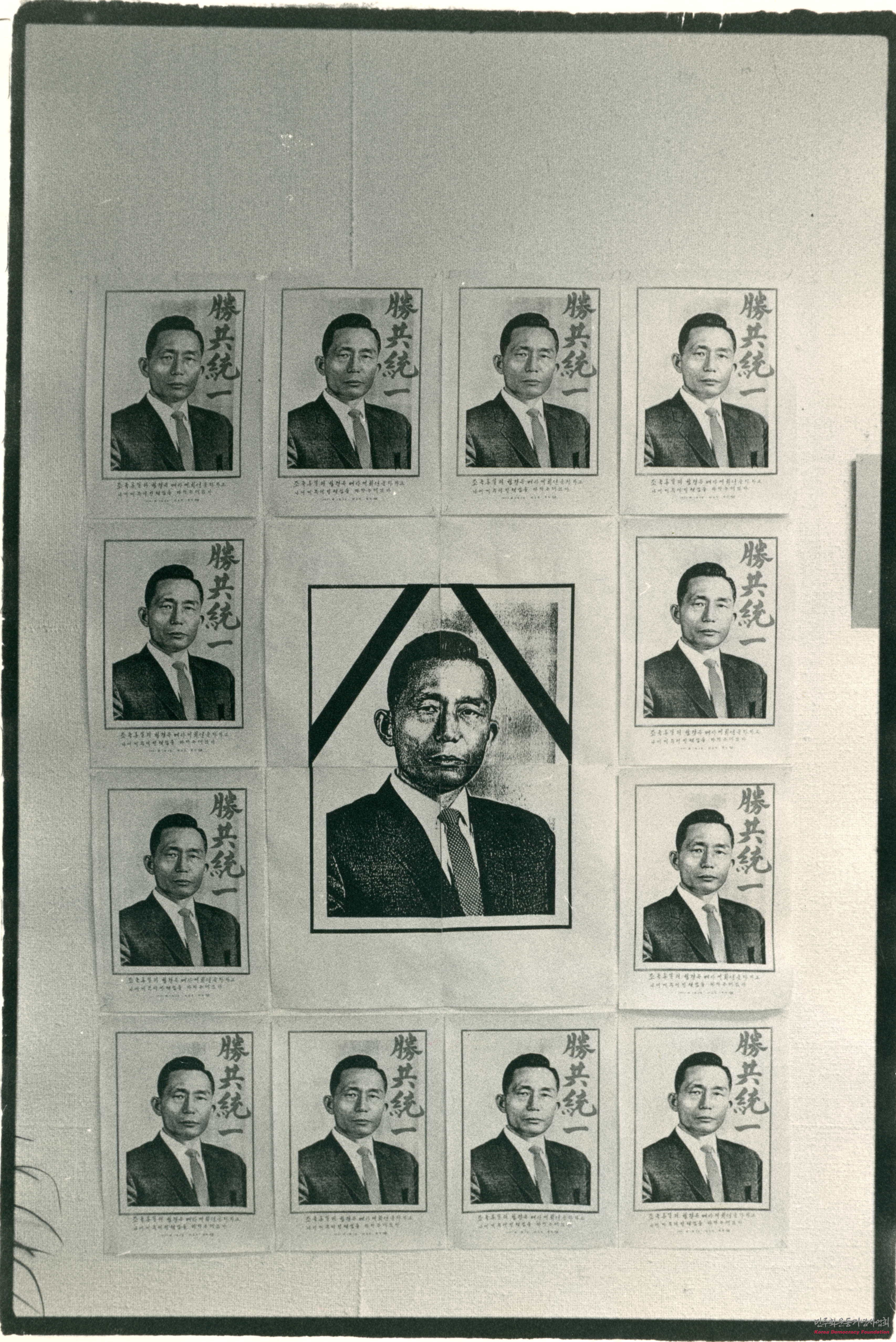 - 승공통일을 주장하는 박정희 그림 11개와, 검은 띠가 펼쳐진 박정희 그림의 모습이 담긴 사진