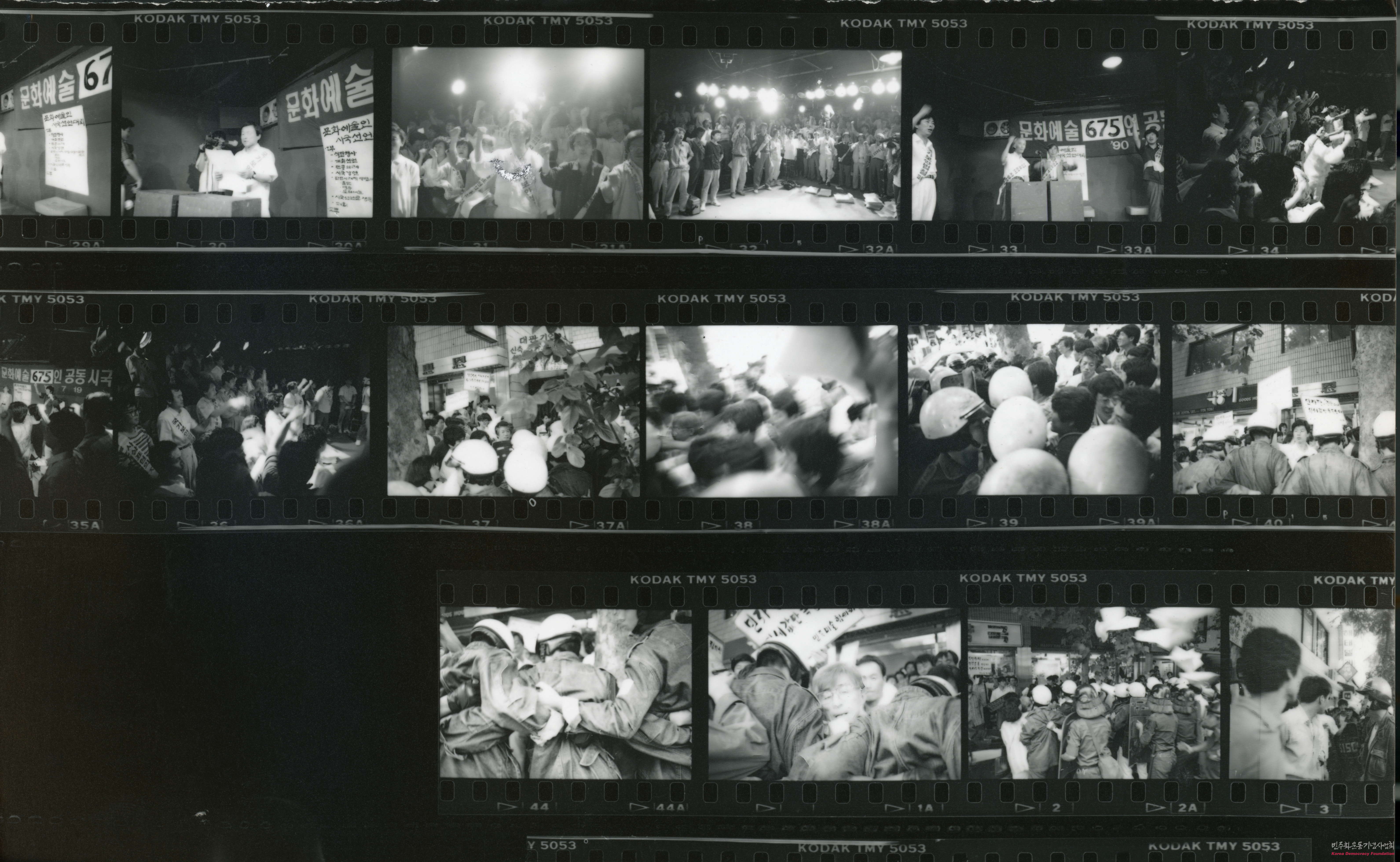 - 1990년 7월 19일 문화예술인 675명 공동 시국 선언대회 사진으로, 이 행사는 서울 종로구 혜화동 예술극장 '한마당'에서 진행되었으며, 문화예술인들은 긴급 시국선언문을 발표하고, 현 정권은 민중생활을 파탄으로 몰아 넣고 민중탄압으로 내각제 장기집권을 획책하고 있기에 모든 민주세력과 함께 문화예술인들은 노태우정권 퇴진투쟁에 나서겠다고 밝혔음
