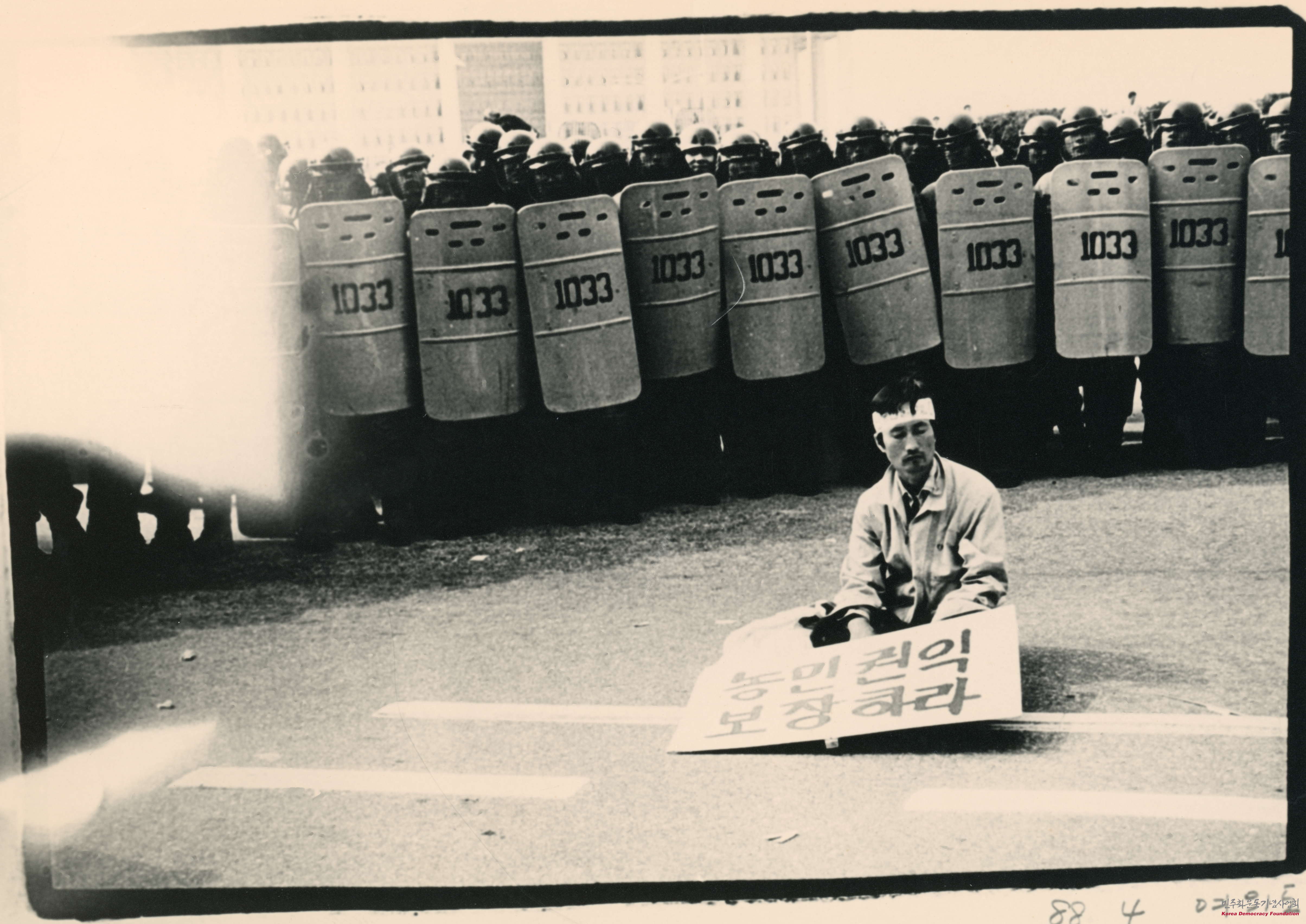 - 농민권익 보장하라'라는 문구가 담긴 팻말을 들고 있는 시민 1인과 그 주위를 둘러 싸고 있는 전투 경찰들의 모습, 백의를 입고 달려 나가는 여성들의 모습 등이 담긴 사진