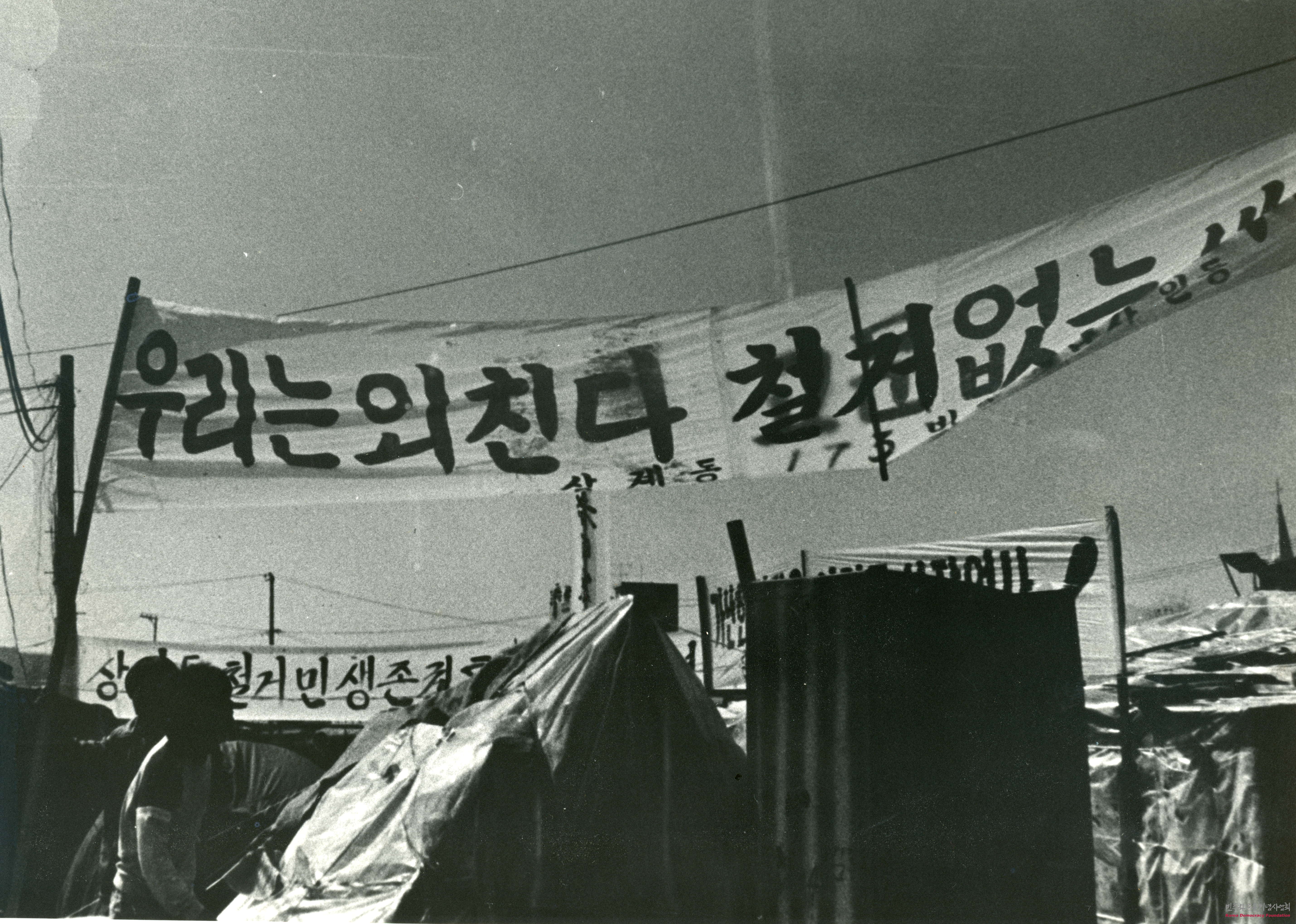 - 상계동 주민들은 철거에 반대하며 생존권을 보장하라는 내용 등이 담긴 현수막과 철거민들을 강제로 대피시키고 철거를 강행하는 모습 등이 담긴 사진