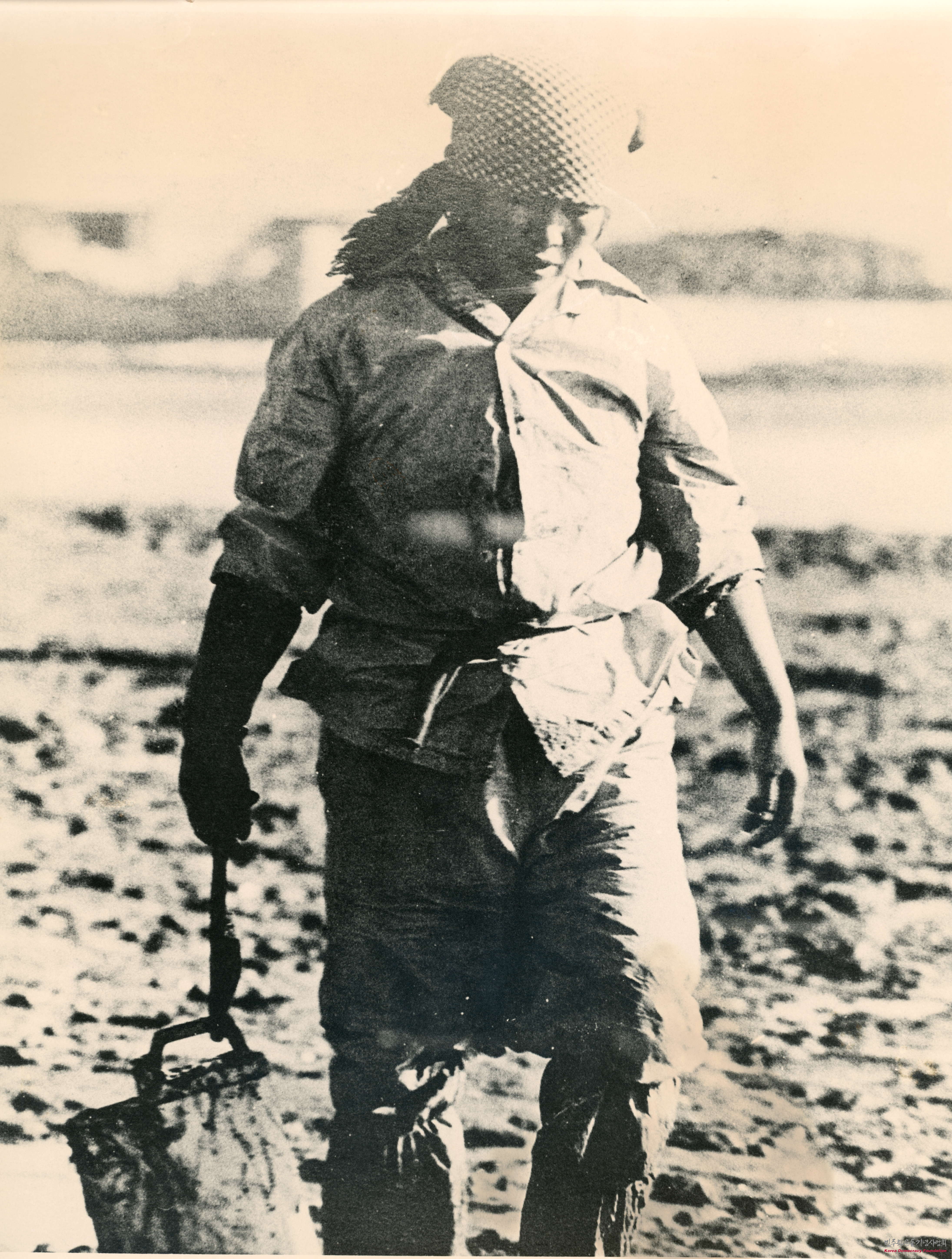 - 갯일 중인 여성과 바다에서 노를 젓고 있는 여성의 모습이 담긴 사진